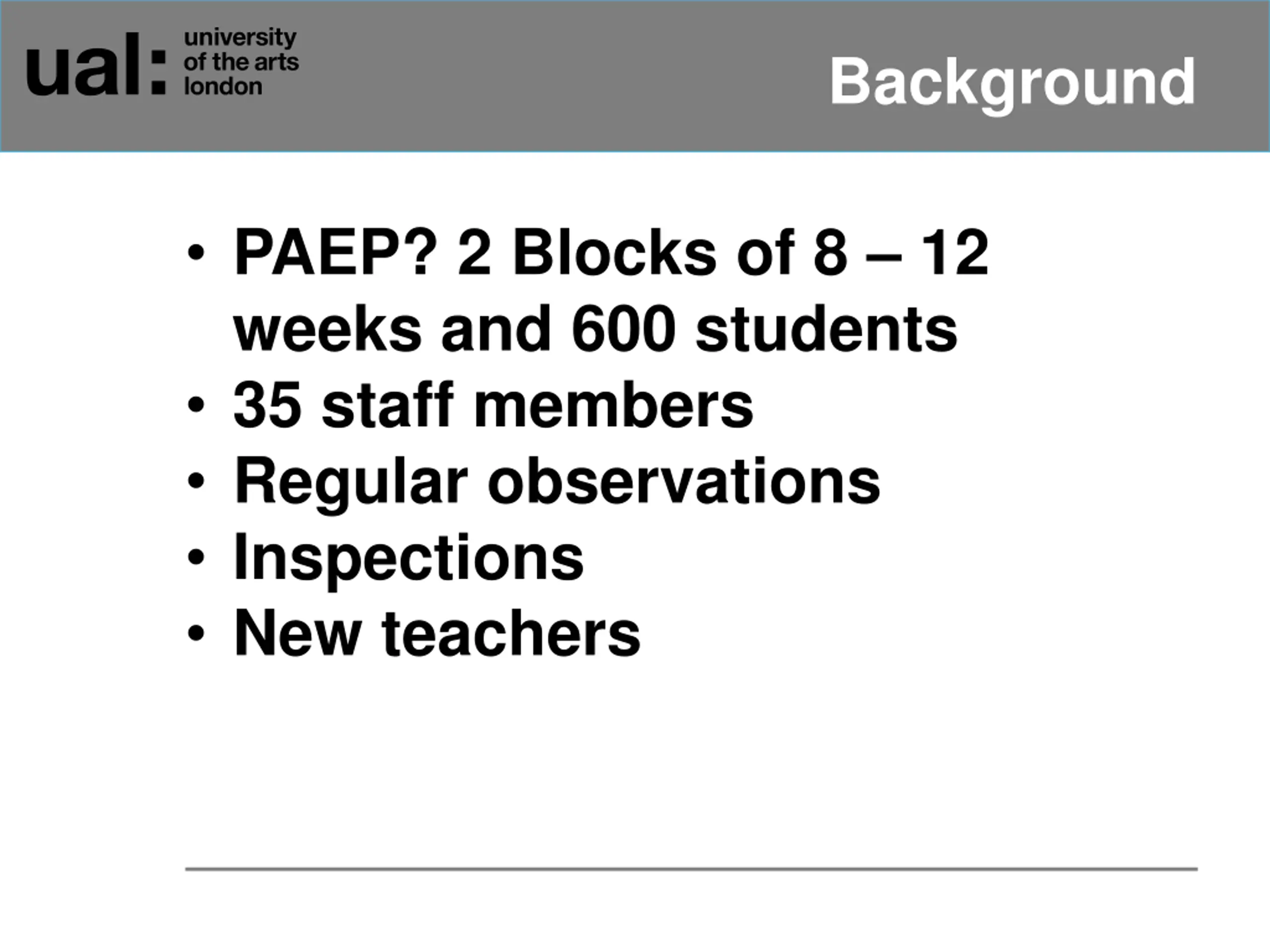 Background PAEP? 2 Blocks of 8 12 weeks and 600 students 35 staff members Regular observations Inspections New teachers