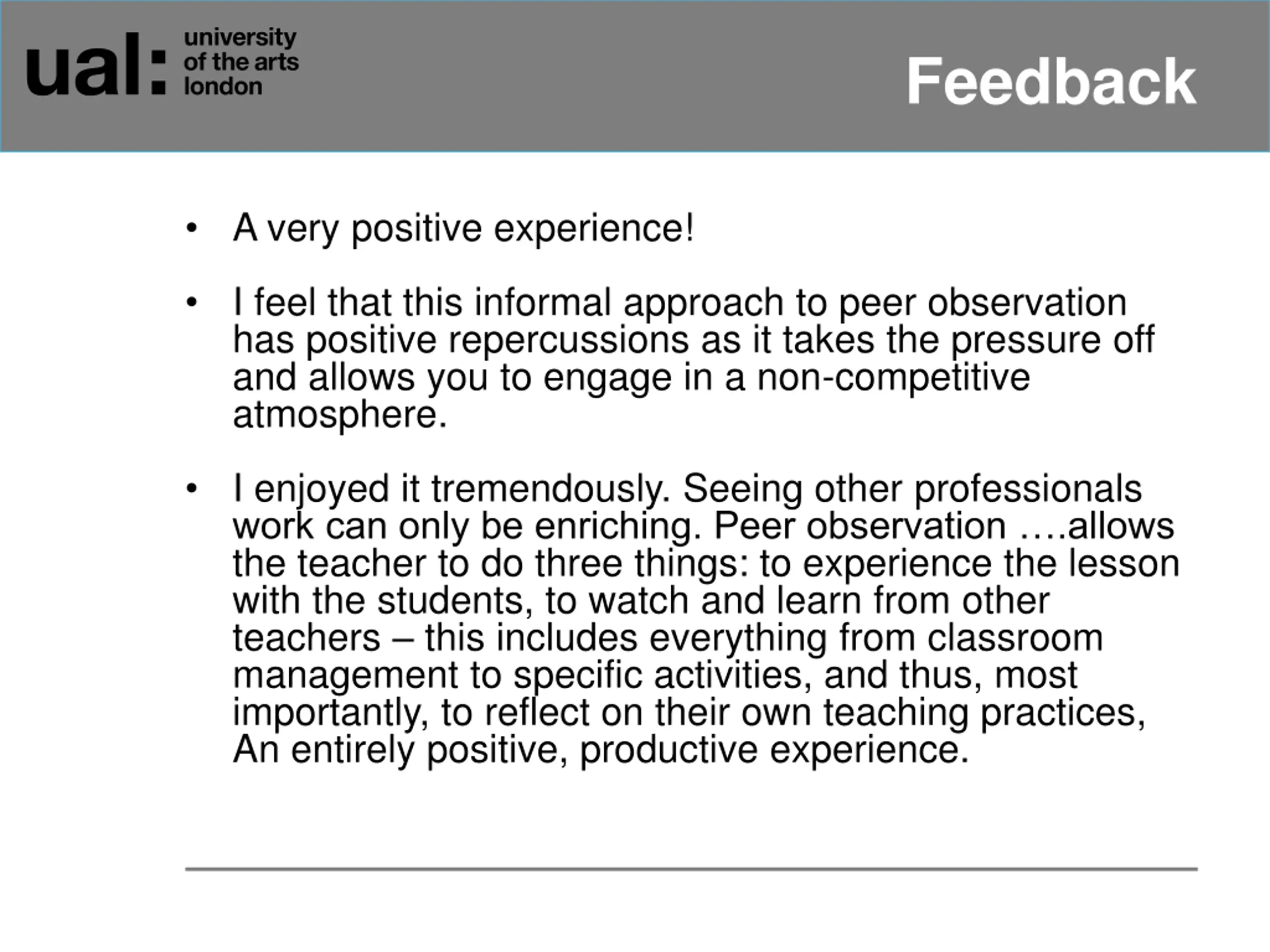 Feedback A very positive experience! I feel that this informal approach to peer observation has positive repercussions as it takes the pressure off and allows you to engage in a non-competitive atmosphere. I enjoyed it tremendously. Seeing other professionals work can only be enriching. Peer observation .allows the teacher to do three things: to experience the lesson with the students, to watch and learn from other teachers this includes everything from classroom management to specific activities, and thus, most importantly, to reflect on their own teaching practices, An entirely positive, productive experience.