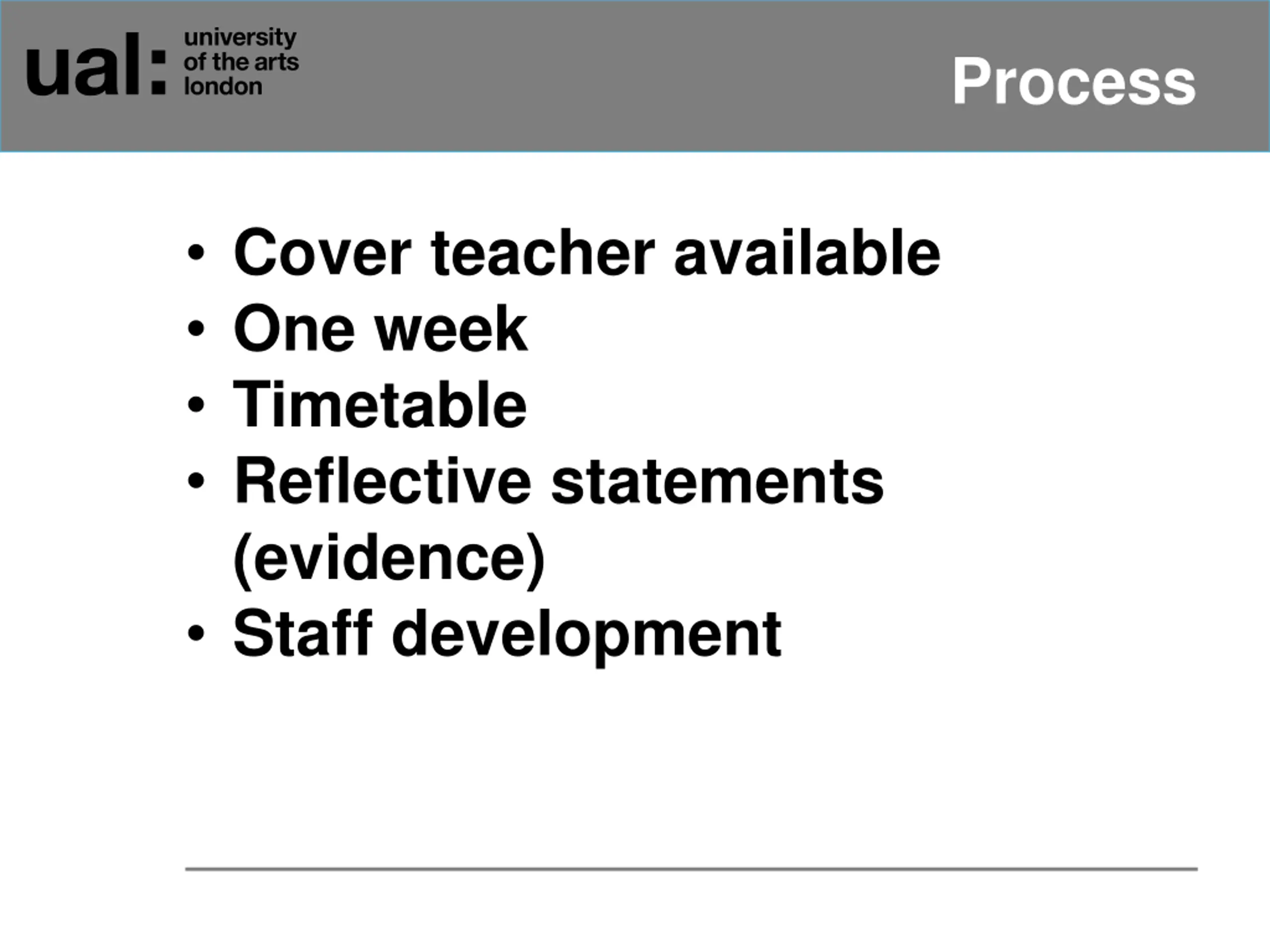 Process Cover teacher available One week Timetable Reflective statements (evidence) Staff development
