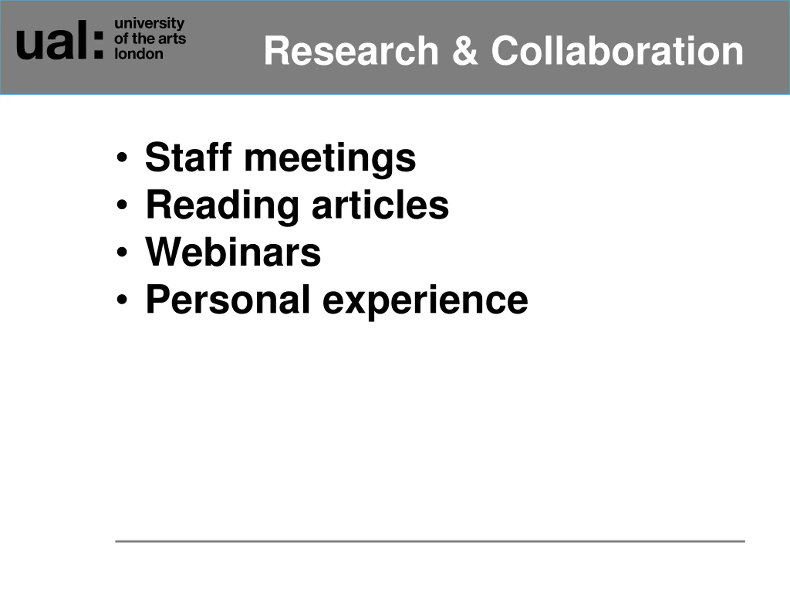 Research & Collaboration Staff meetings Reading articles Webinars Personal experience