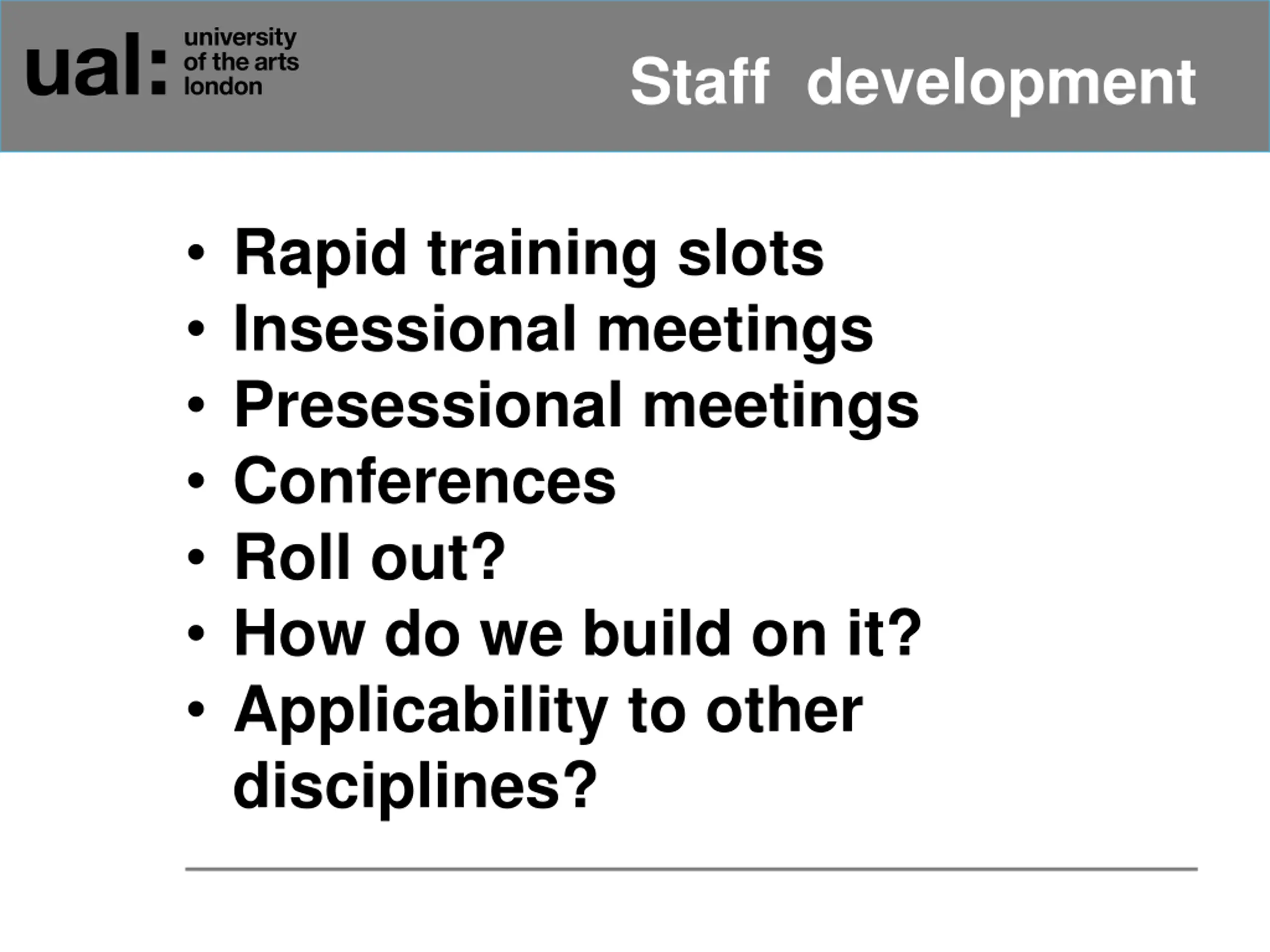 Staff development Rapid training slots Insessional meetings Presessional meetings Conferences Roll out? How do we build on it? Applicability to other disciplines?