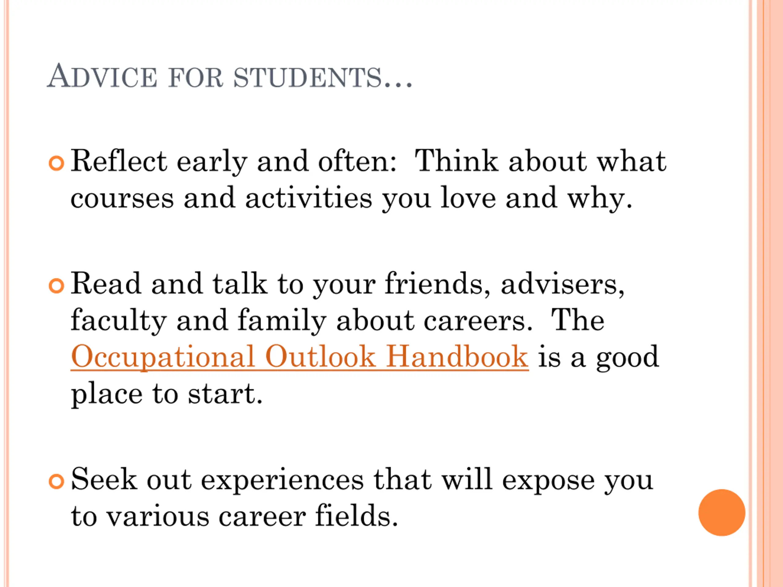 ADVICE FOR STUDENTS Reflect early and often: Think about what courses and activities you love and why. Read and talk to your friends, advisers, faculty and family about careers. The Occupational Outlook Handbook is a good place to start. Seek out experiences that will expose you to various career fields.