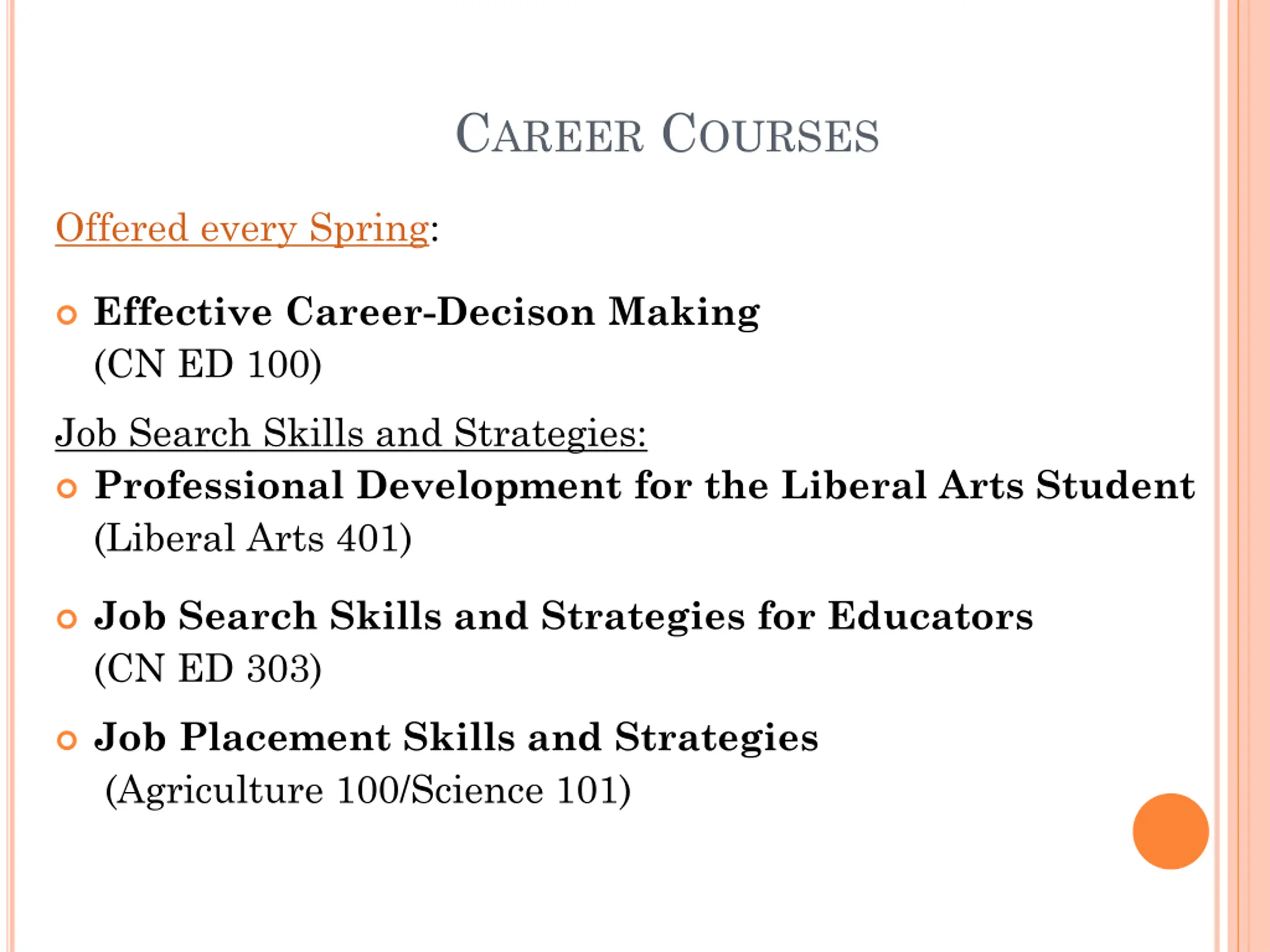 CAREER COURSES Offered every Spring: Effective Career-Decison Making (CN ED 100) Job Search Skills and Strategies: Professional Development for the Liberal Arts Student (Liberal Arts 401) Job Search Skills and Strategies for Educators (CN ED 303) Job Placement Skills and Strategies (Agriculture 100/Science 101)