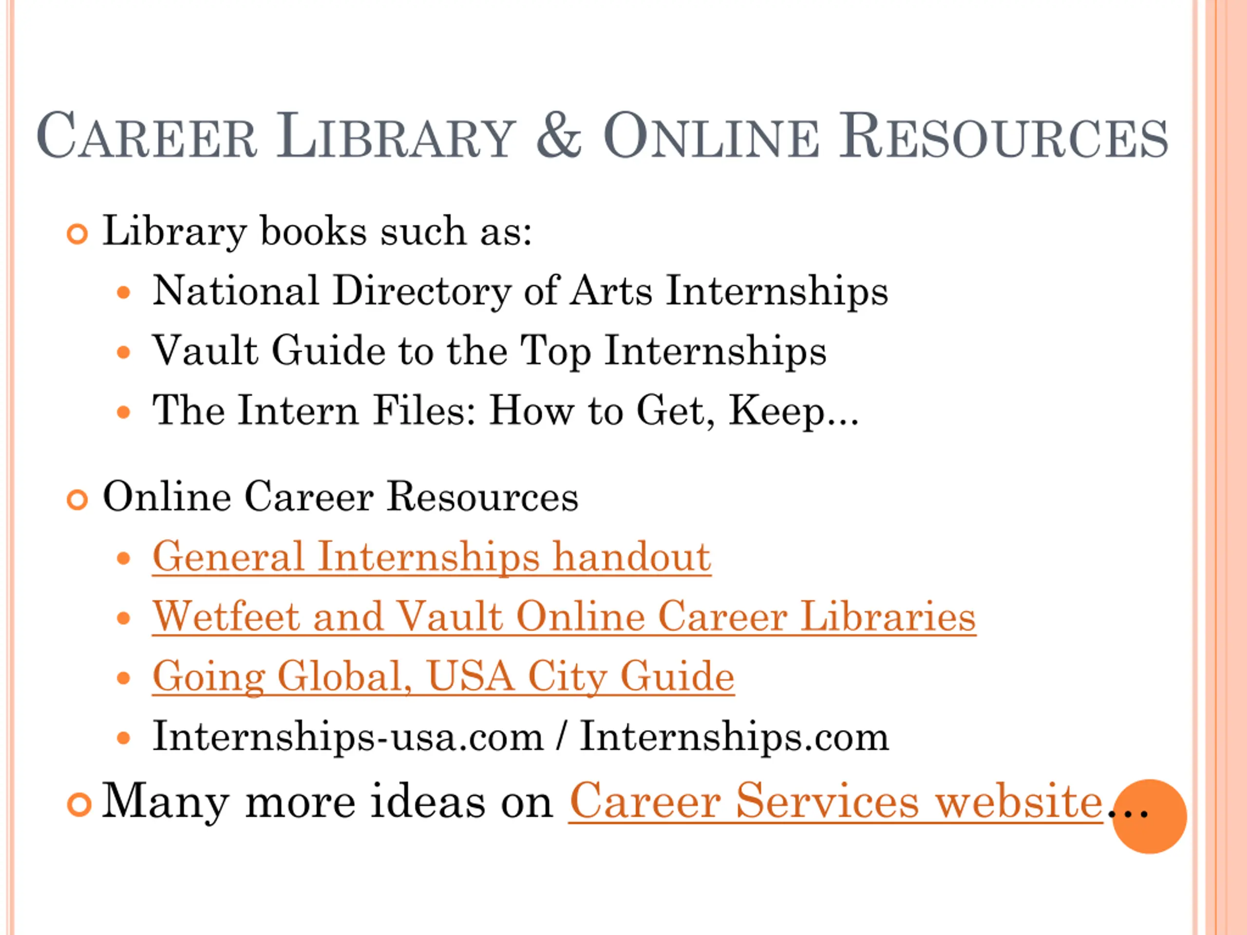CAREER LIBRARY & ONLINE RESOURCES Library books such as: National Directory of Arts Internships Vault Guide to the Top Internships The Intern Files: How to Get, Keep... Online Career Resources General Internships handout Wetfeet and Vault Online Career Libraries Going Global, USA City Guide Internships-usa.com / Internships.com Many more ideas on Career Services website