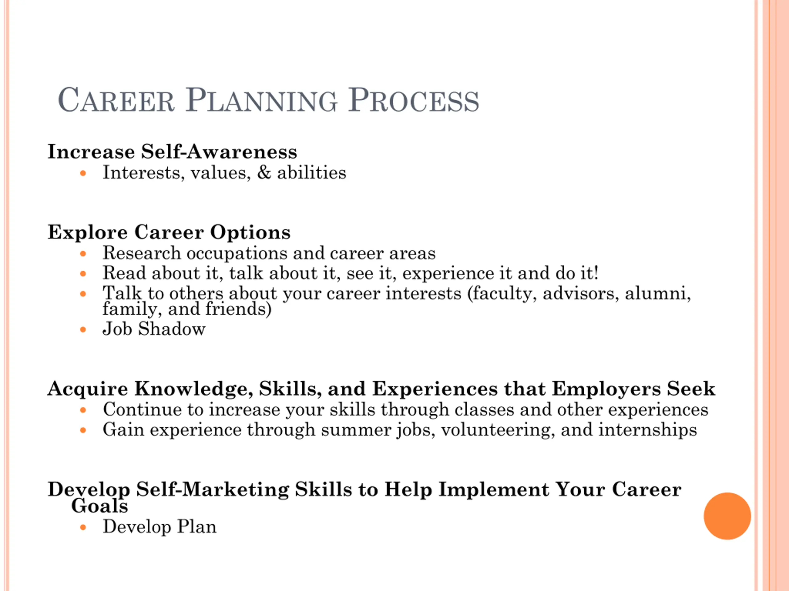CAREER PLANNING PROCESS Increase Self-Awareness Interests, values, & abilities Explore Career Options Research occupations and career areas Read about it, talk about it, see it, experience it and do it! Talk to others about your career interests (faculty, advisors, alumni, family, and friends) Job Shadow Acquire Knowledge, Skills, and Experiences that Employers Seek Continue to increase your skills through classes and other experiences Gain experience through summer jobs, volunteering, and internships Develop Self-Marketing Skills to Help Implement Your Career Goals Develop Plan