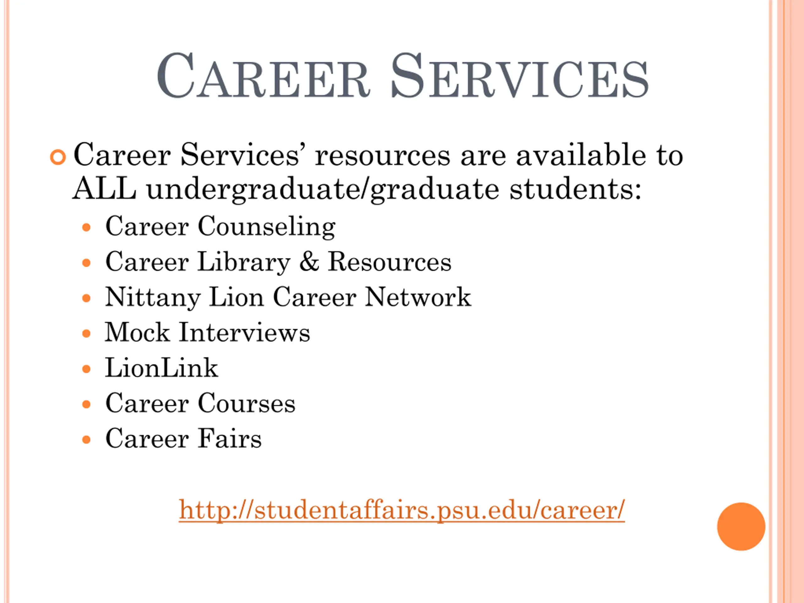 CAREER SERVICES Career Services resources are available to ALL undergraduate/graduate students: Career Counseling Career Library & Resources Nittany Lion Career Network Mock Interviews LionLink Career Courses Career Fairs http://studentaffairs.psu.edu/career/