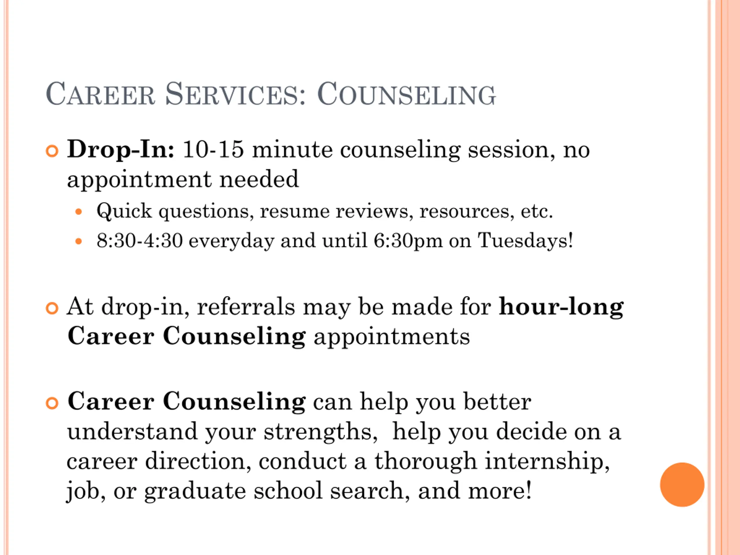 CAREER SERVICES: COUNSELING Drop-In: 10-15 minute counseling session, no appointment needed Quick questions, resume reviews, resources, etc. 8:30-4:30 everyday and until 6:30pm on Tuesdays! At drop-in, referrals may be made for hour-long Career Counseling appointments Career Counseling can help you better understand your strengths, help you decide on a career direction, conduct a thorough internship, job, or graduate school search, and more!