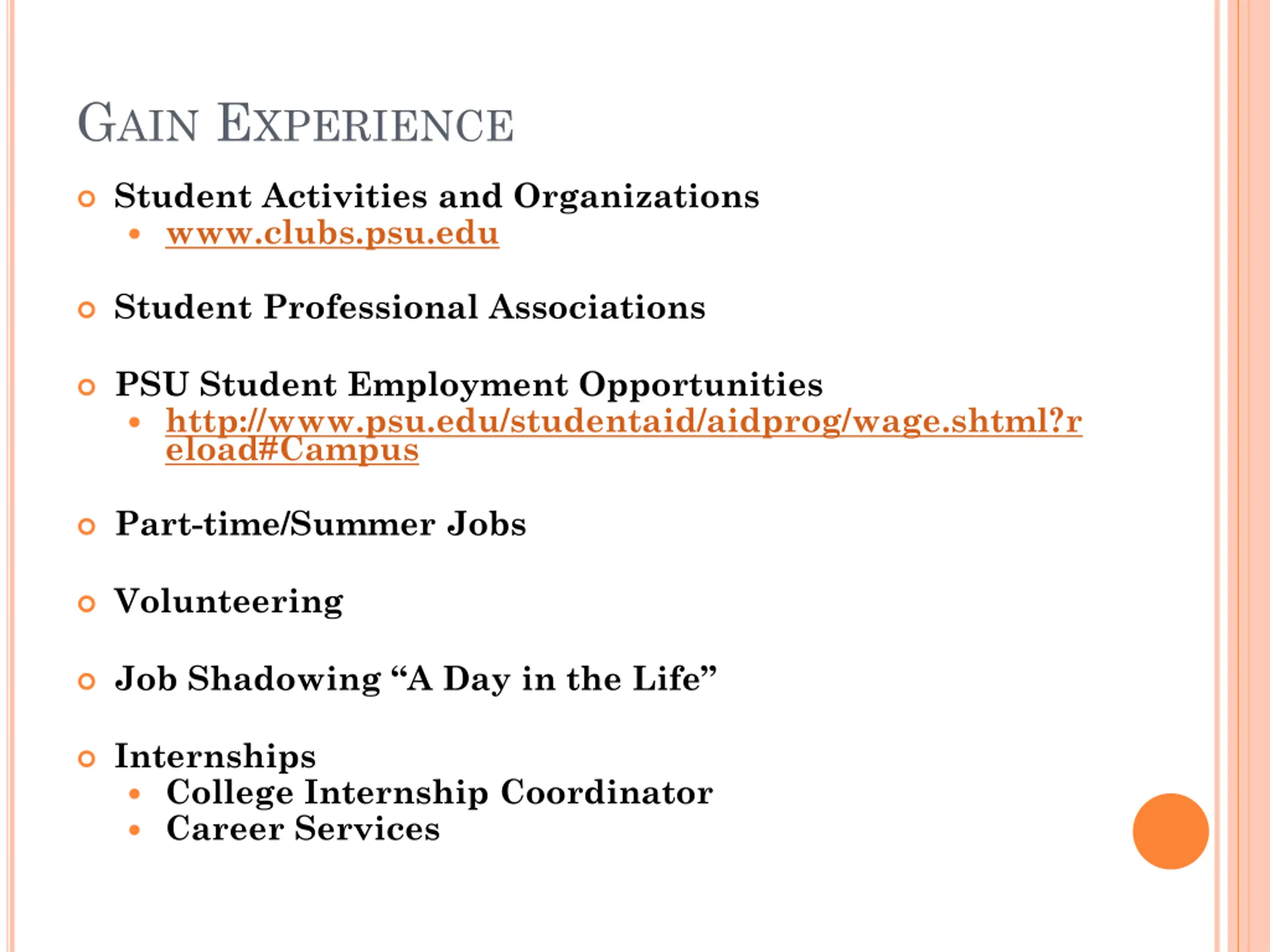 GAIN EXPERIENCE Student Activities and Organizations www.clubs.psu.edu Student Professional Associations PSU Student Employment Opportunities http://www.psu.edu/studentaid/aidprog/wage.shtml?r eload#Campus Part-time/Summer Jobs Volunteering Job Shadowing A Day in the Life Internships College Internship Coordinator Career Services