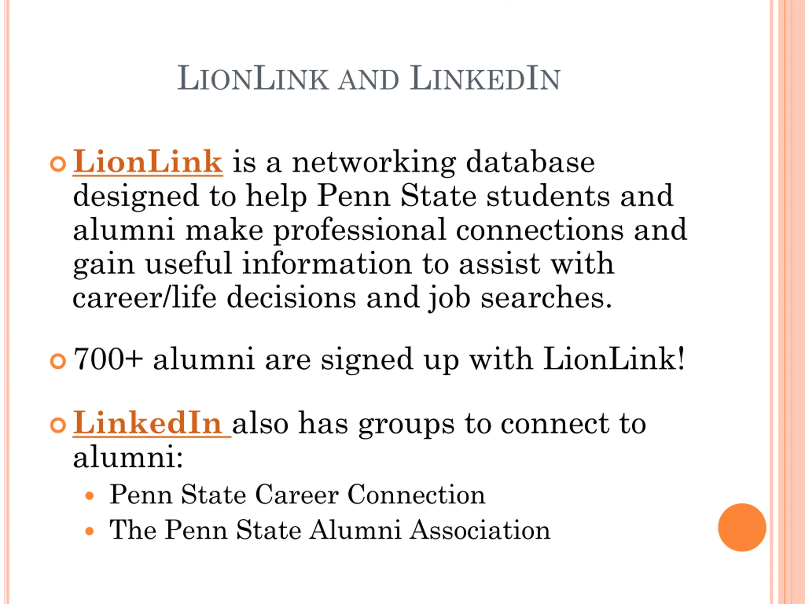 LIONLINK AND LINKEDIN LionLink is a networking database designed to help Penn State students and alumni make professional connections and gain useful information to assist with career/life decisions and job searches. 700+ alumni are signed up with LionLink! LinkedIn also has groups to connect to alumni: Penn State Career Connection The Penn State Alumni Association