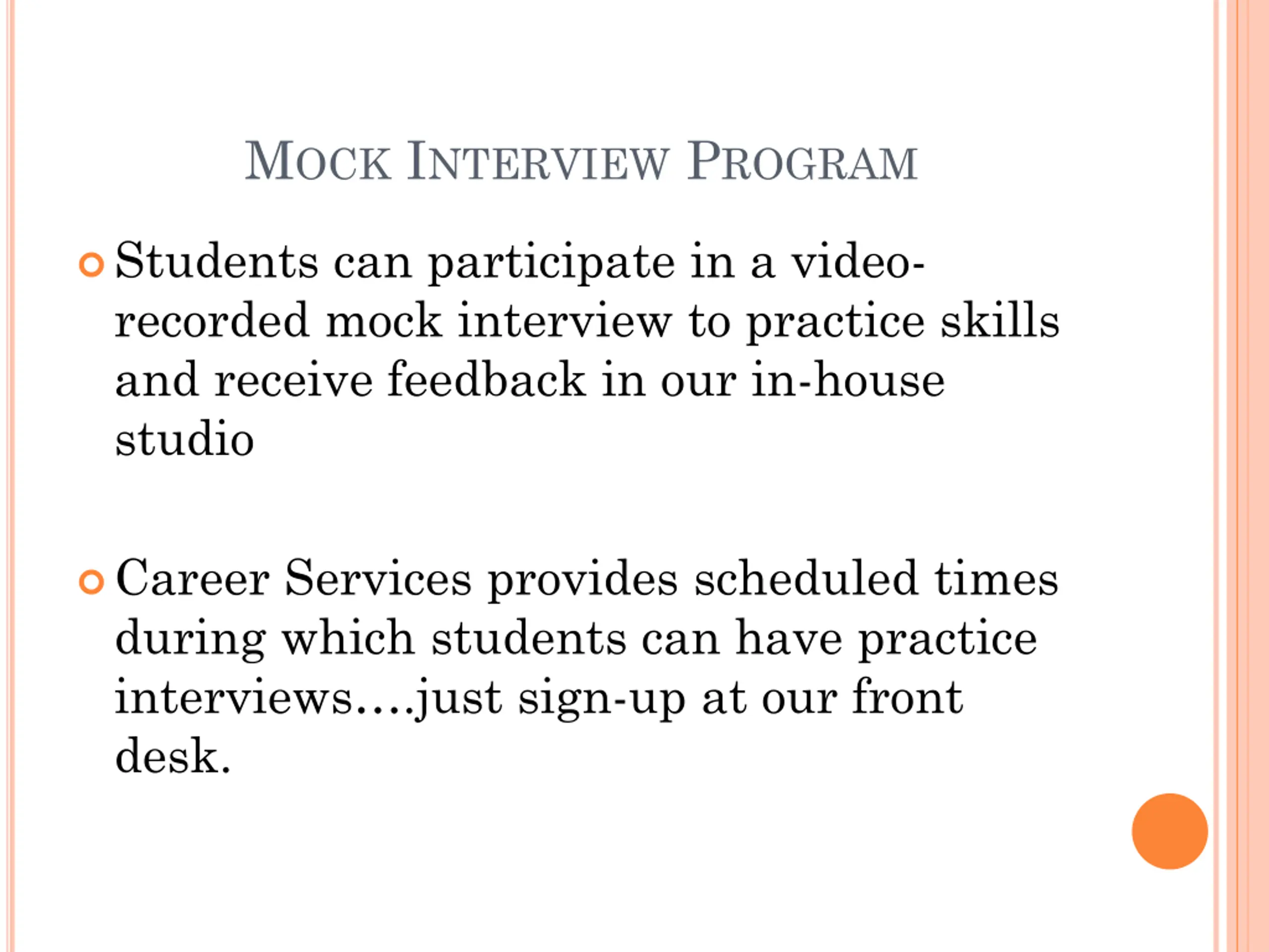 MOCK INTERVIEW PROGRAM Students can participate in a video- recorded mock interview to practice skills and receive feedback in our in-house studio Career Services provides scheduled times during which students can have practice interviews .just sign-up at our front desk.