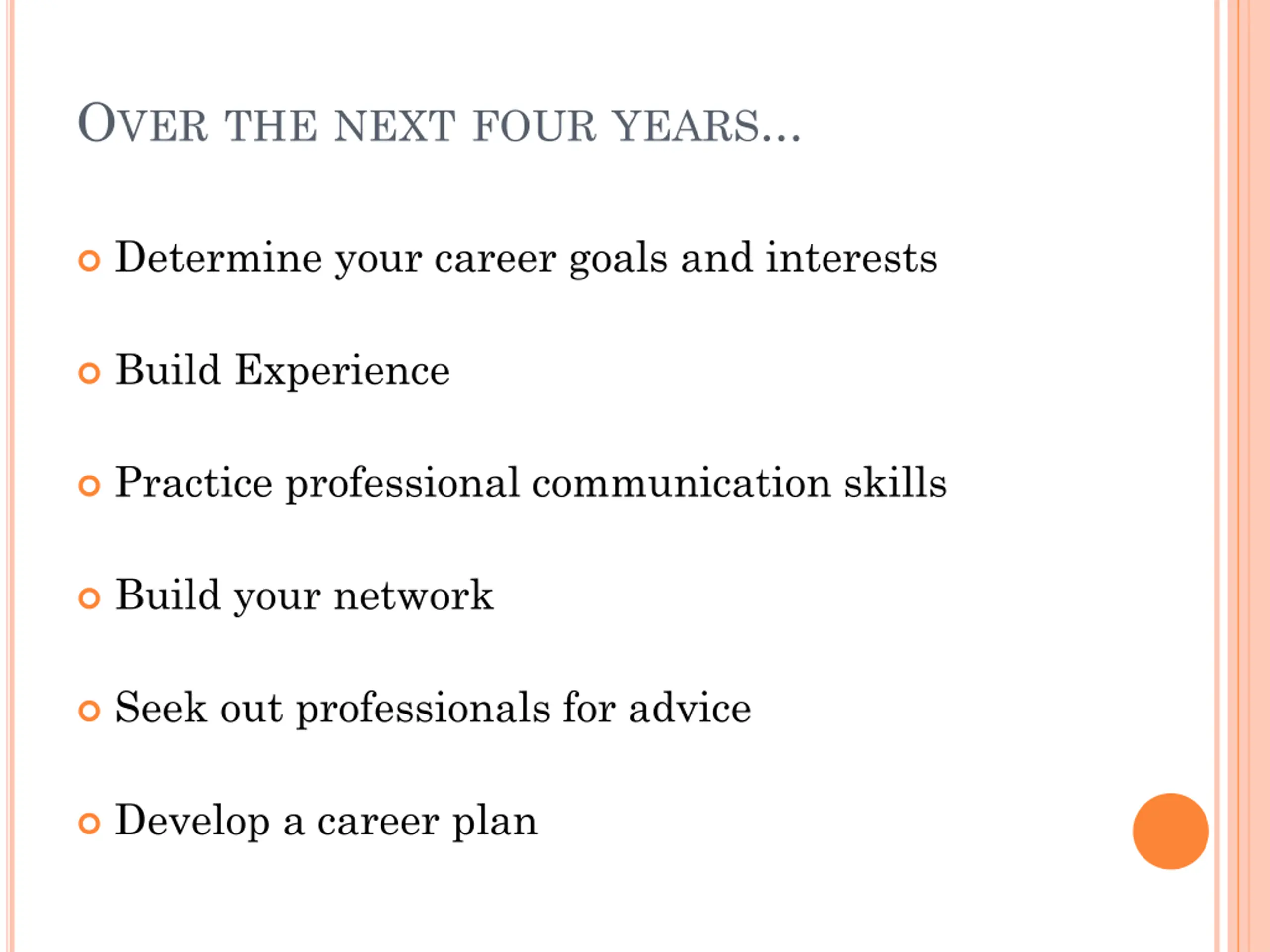 OVER THE NEXT FOUR YEARS... Determine your career goals and interests Build Experience Practice professional communication skills Build your network Seek out professionals for advice Develop a career plan