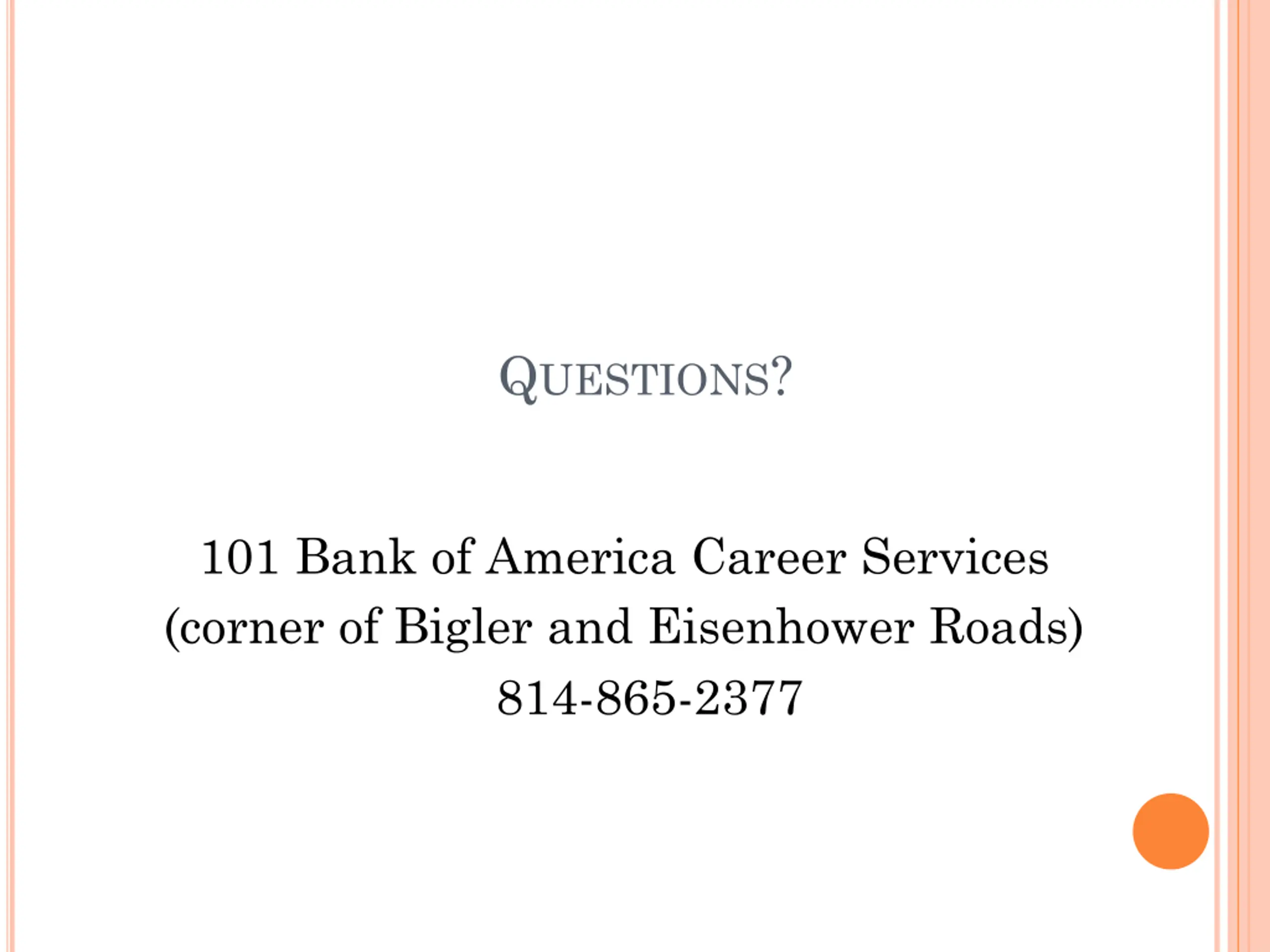 QUESTIONS? 101 Bank of America Career Services (corner of Bigler and Eisenhower Roads) 814-865-2377