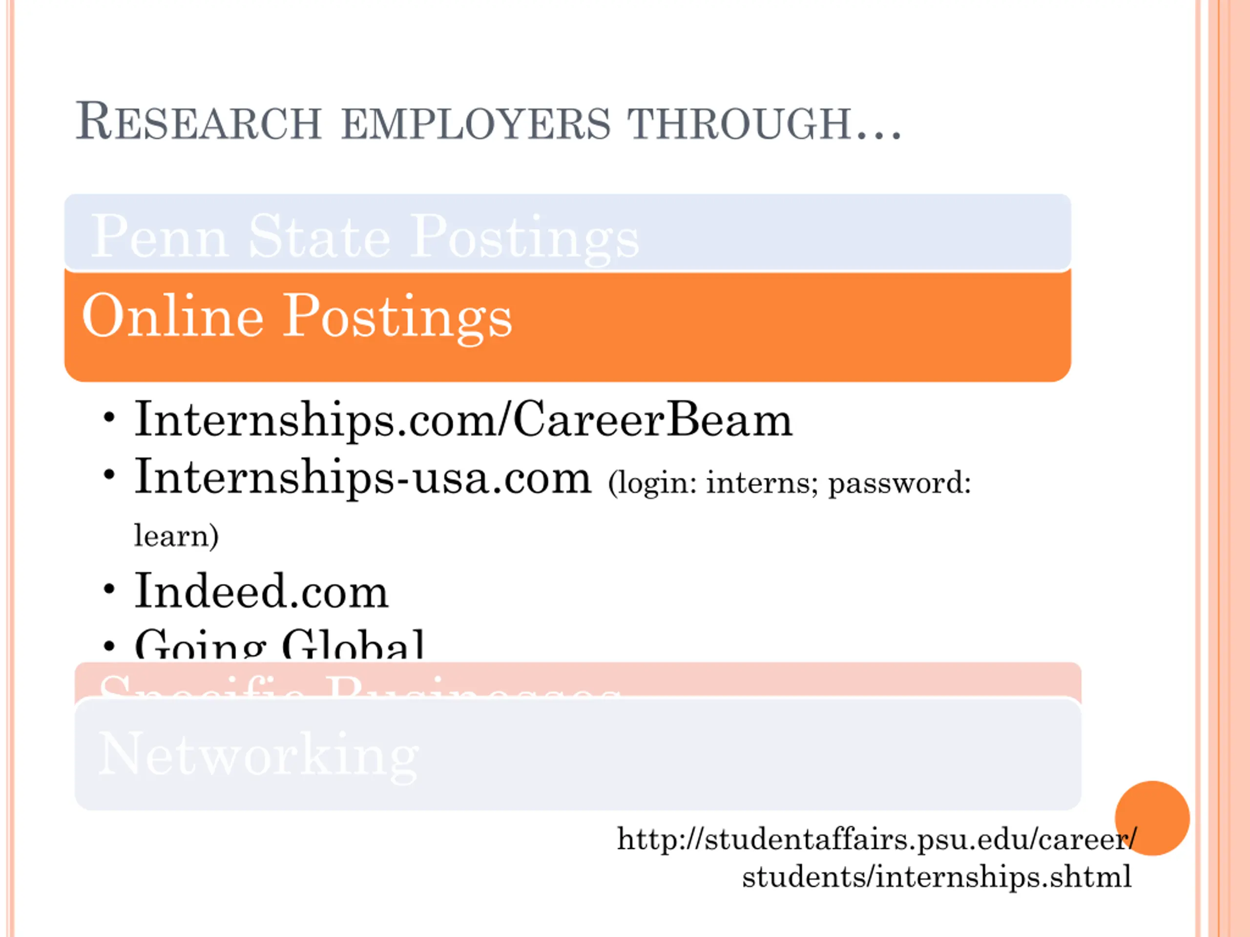RESEARCHEMPLOYERSTHROUGH Penn State Postings Online Postings Specific Businesses CareerBeam Hoovers Online (access through PSU libraries) WetFeet or Vault Professional Associations Networking http://studentaffairs.psu.edu/career/ students/internships.shtml