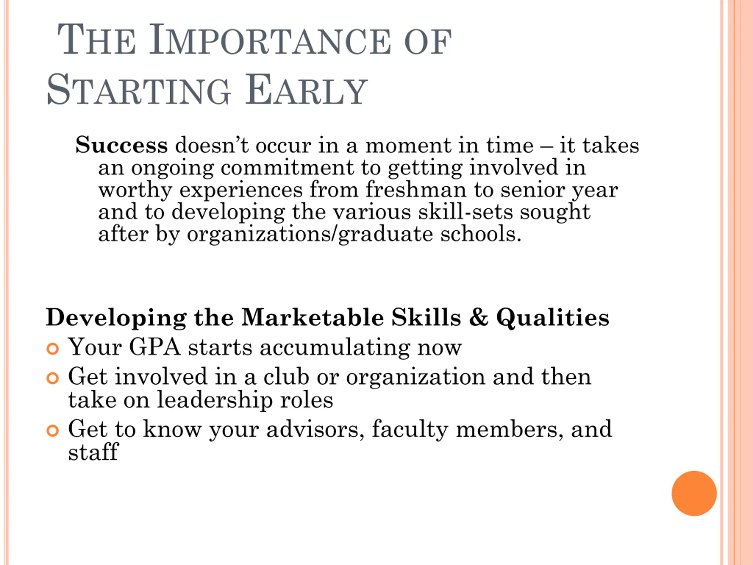 THE IMPORTANCE OF STARTING EARLY Success doesn t occur in a moment in time it takes an ongoing commitment to getting involved in worthy experiences from freshman to senior year and to developing the various skill-sets sought after by organizations/graduate schools. Developing the Marketable Skills & Qualities Your GPA starts accumulating now Get involved in a club or organization and then take on leadership roles Get to know your advisors, faculty members, and staff