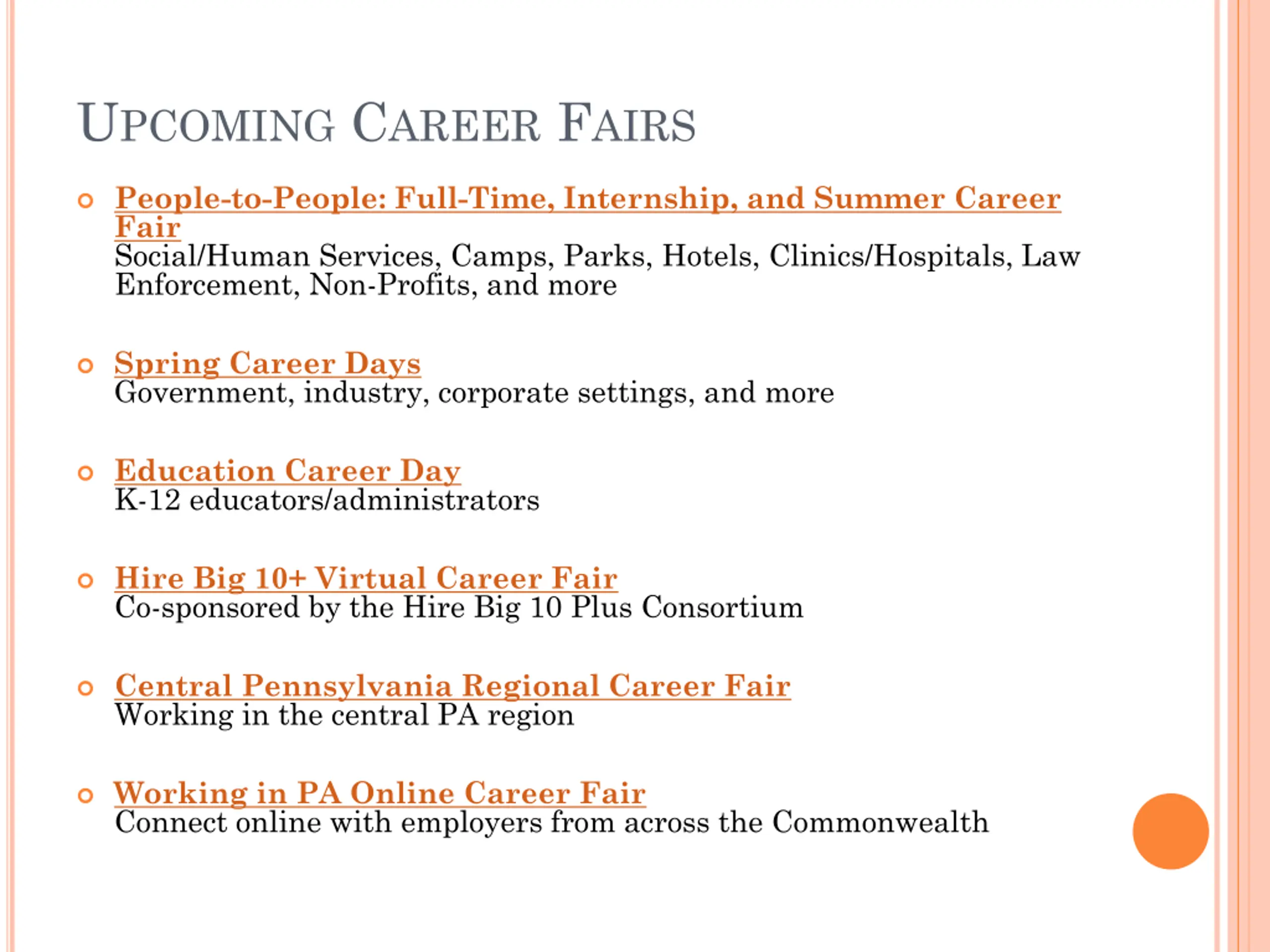 UPCOMING CAREER FAIRS People-to-People: Full-Time, Internship, and Summer Career Fair Social/Human Services, Camps, Parks, Hotels, Clinics/Hospitals, Law Enforcement, Non-Profits, and more Spring Career Days Government, industry, corporate settings, and more Education Career Day K-12 educators/administrators Hire Big 10+ Virtual Career Fair Co-sponsored by the Hire Big 10 Plus Consortium Central Pennsylvania Regional Career Fair Working in the central PA region Working in PA Online Career Fair Connect online with employers from across the Commonwealth