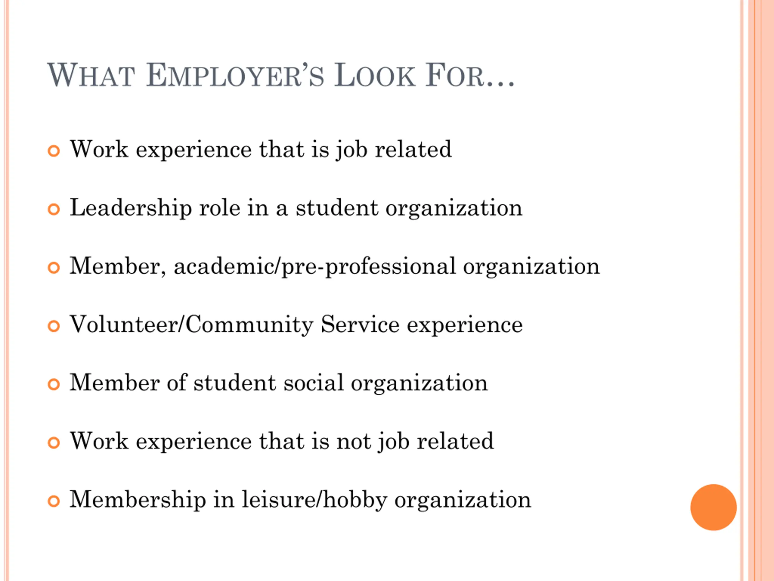 WHAT EMPLOYERS LOOK FOR Work experience that is job related Leadership role in a student organization Member, academic/pre-professional organization Volunteer/Community Service experience Member of student social organization Work experience that is not job related Membership in leisure/hobby organization