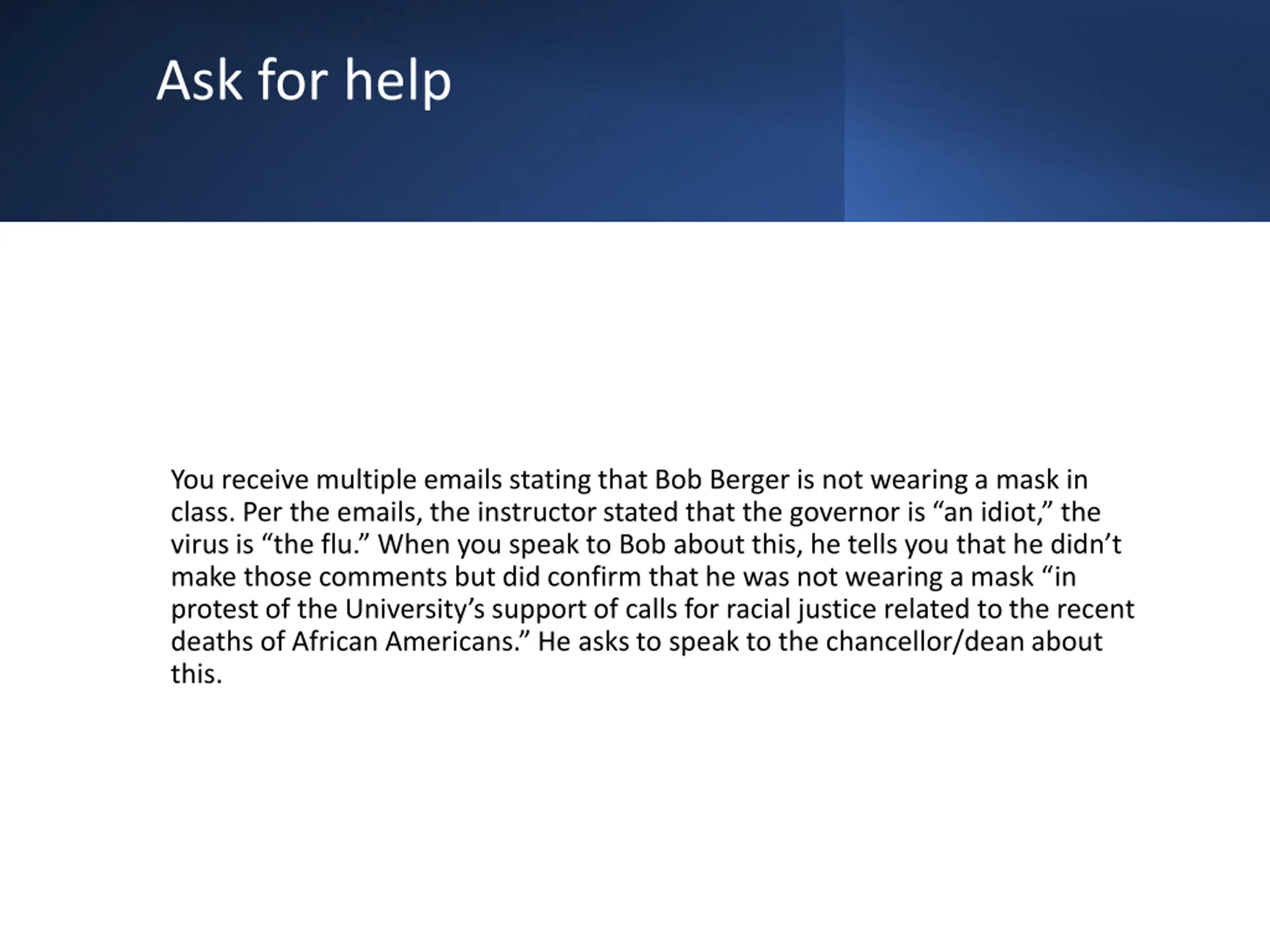 Ask for help You receive multiple emails stating that Bob Berger is not wearing a mask in class. Per the emails, the instructor stated that the governor is an idiot, the virus is the flu. When you speak to Bob about this, he tells you that he didn t make those comments but did confirm that he was not wearing a mask in protest of the University s support of calls for racial justice related to the recent deaths of African Americans. He asks to speak to the chancellor/dean about this.