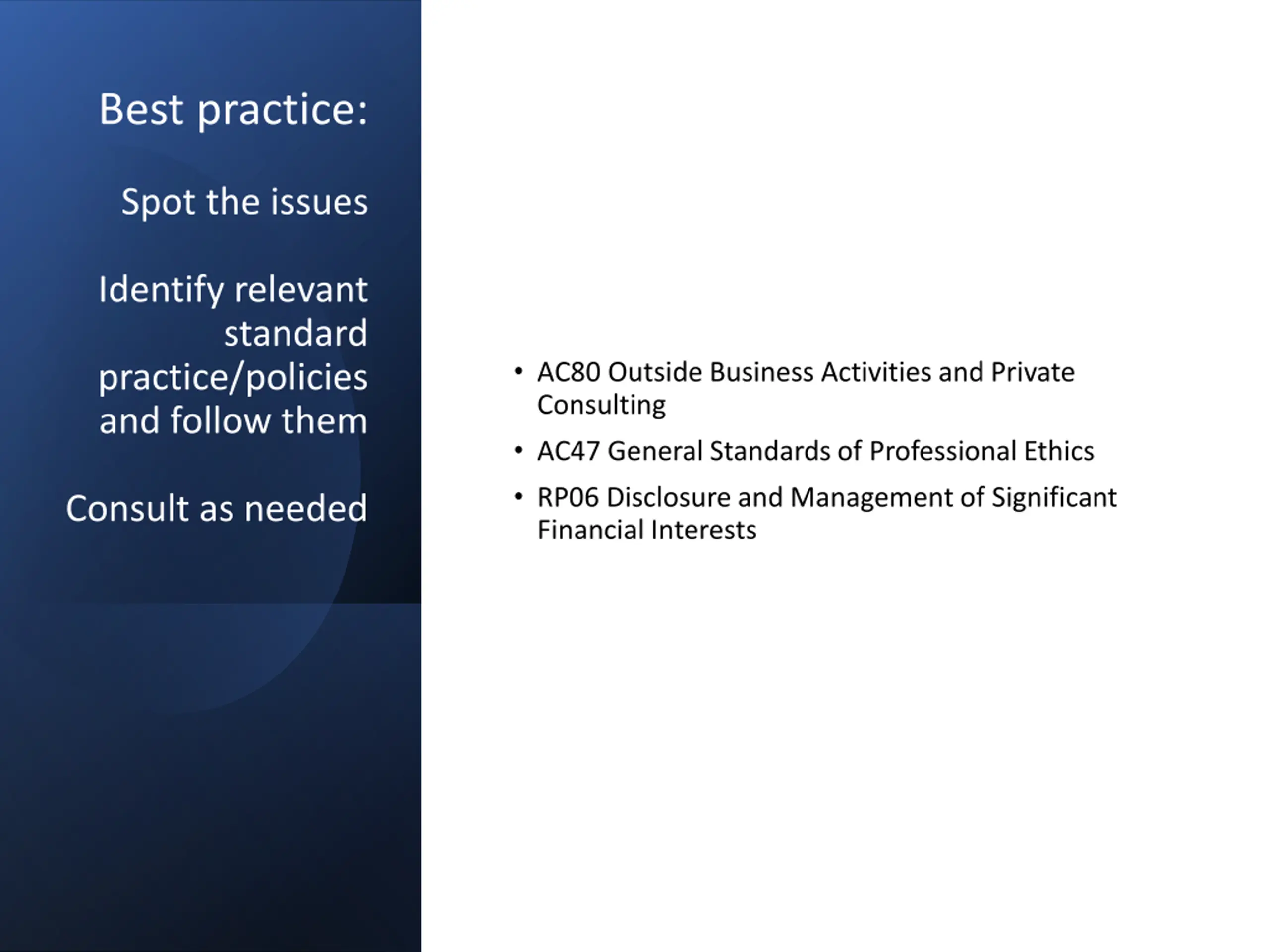 Best practice: Spot the issues Identify relevant standard practice/policies and follow them AC80 Outside Business Activities and Private Consulting AC47 General Standards of Professional Ethics RP06 Disclosure and Management of Significant Financial Interests Consult as needed
