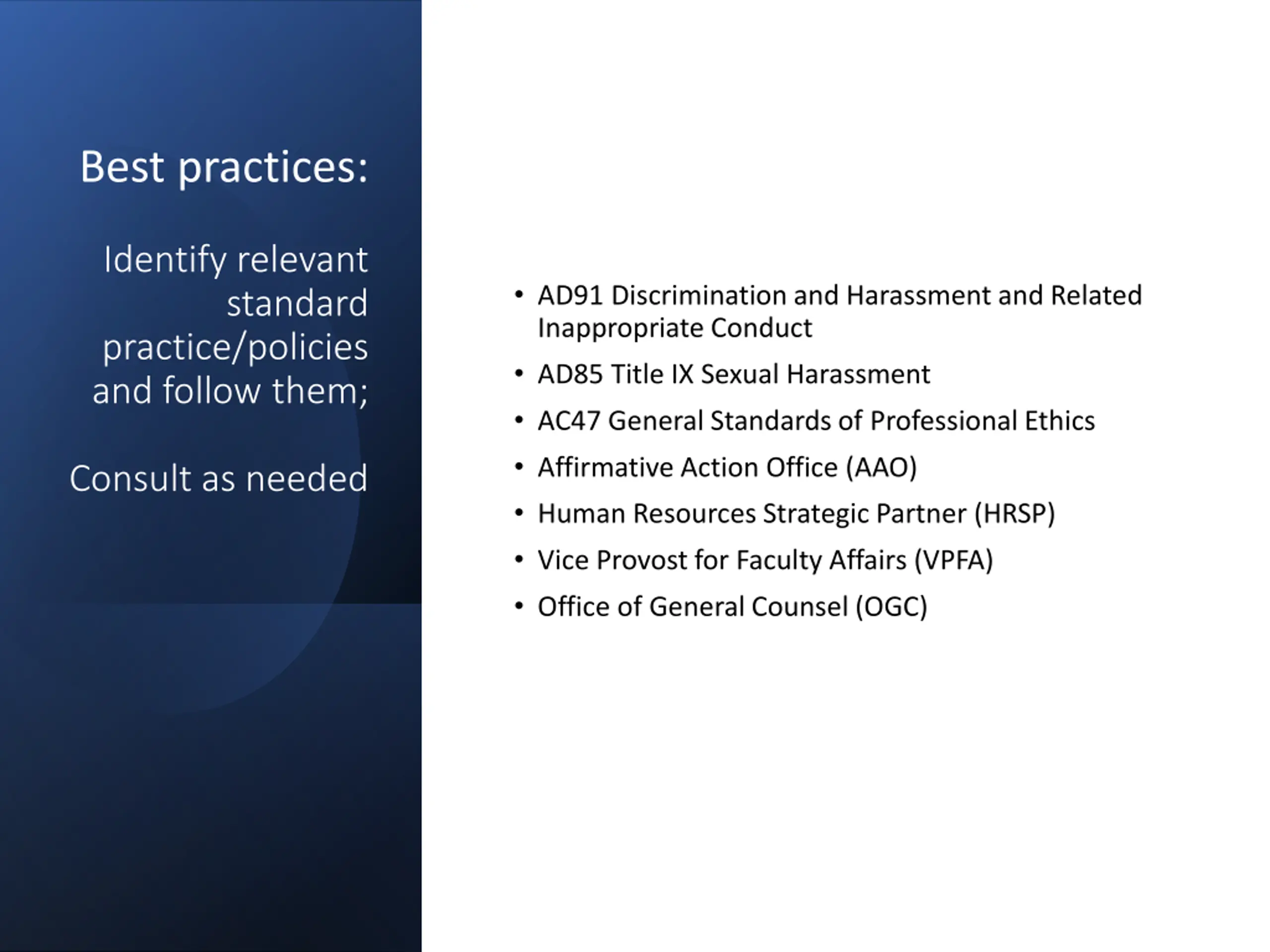 Best practices: Identify relevant standard practice/policies and follow them; AD91 Discrimination and Harassment and Related Inappropriate Conduct AD85 Title IX Sexual Harassment AC47 General Standards of Professional Ethics Affirmative Action Office (AAO) Human Resources Strategic Partner (HRSP) Vice Provost for Faculty Affairs (VPFA) Office of General Counsel (OGC) Consult as needed