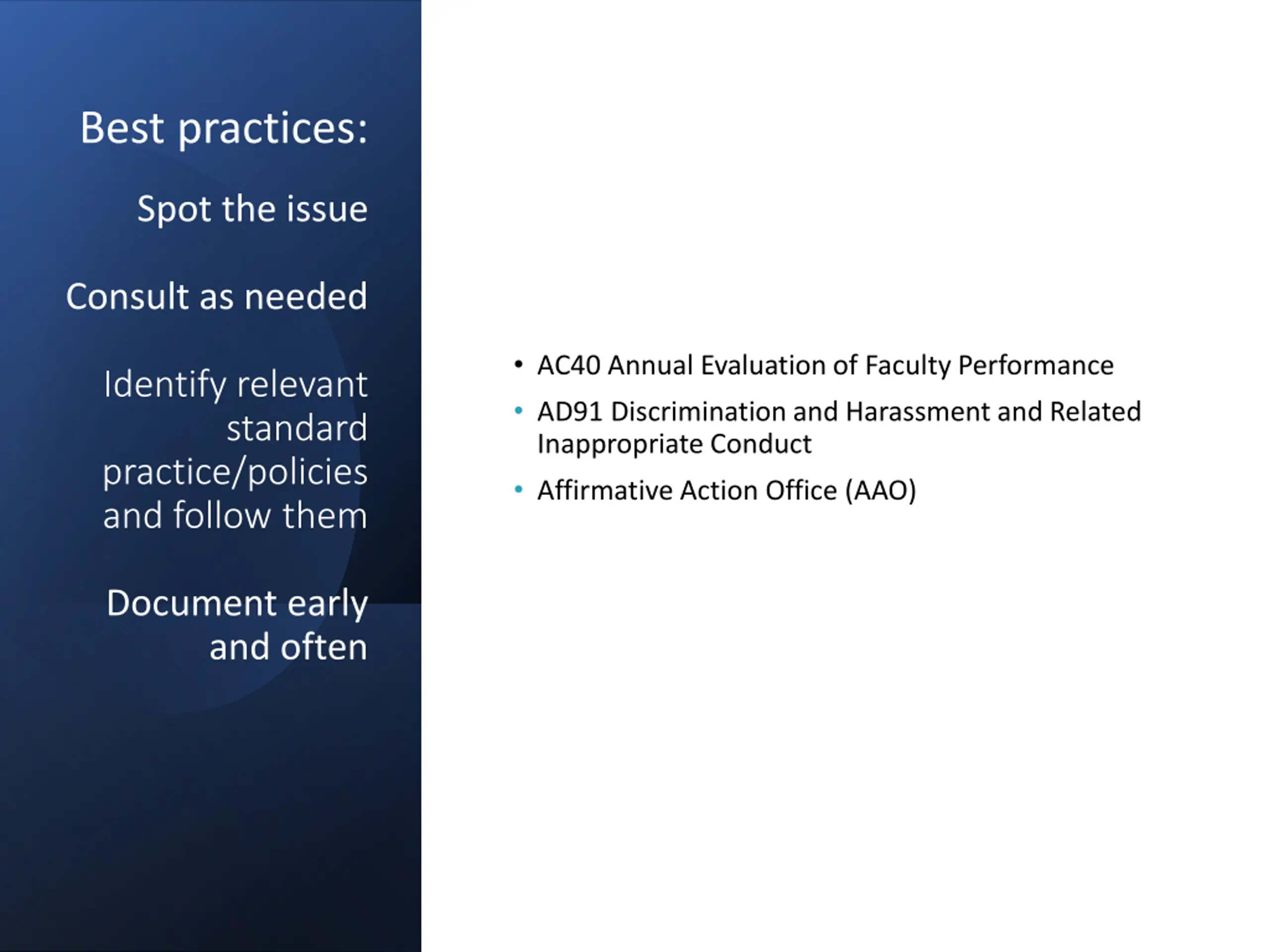 Best practices: Spot the issue Consult as needed AC40 Annual Evaluation of Faculty Performance AD91 Discrimination and Harassment and Related Inappropriate Conduct Affirmative Action Office (AAO) Identify relevant standard practice/policies and follow them Document early and often