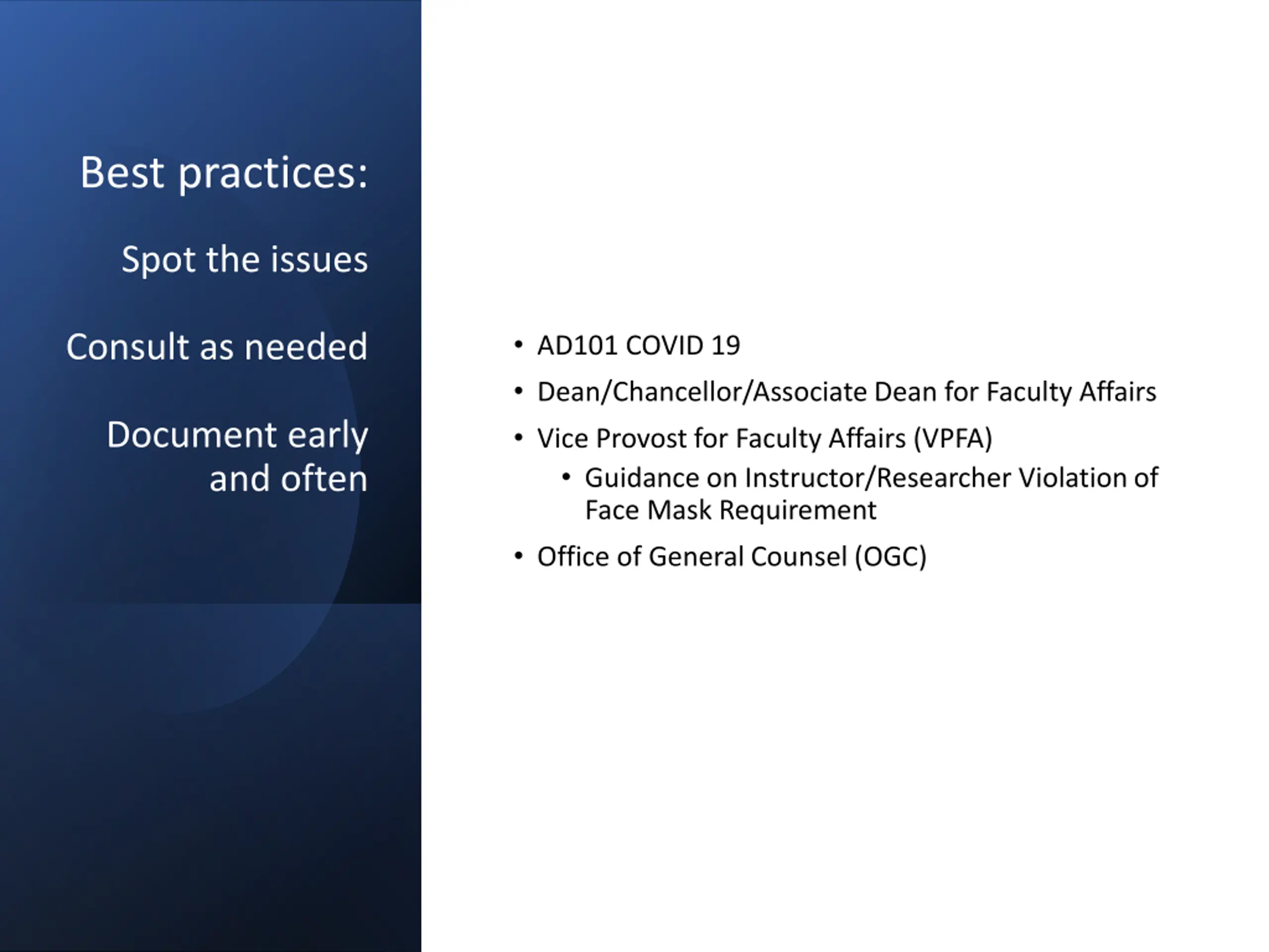 Best practices: Spot the issues AD101 COVID 19 Dean/Chancellor/Associate Dean for Faculty Affairs Vice Provost for Faculty Affairs (VPFA) Guidance on Instructor/Researcher Violation of Face Mask Requirement Office of General Counsel (OGC) Consult as needed Document early and often