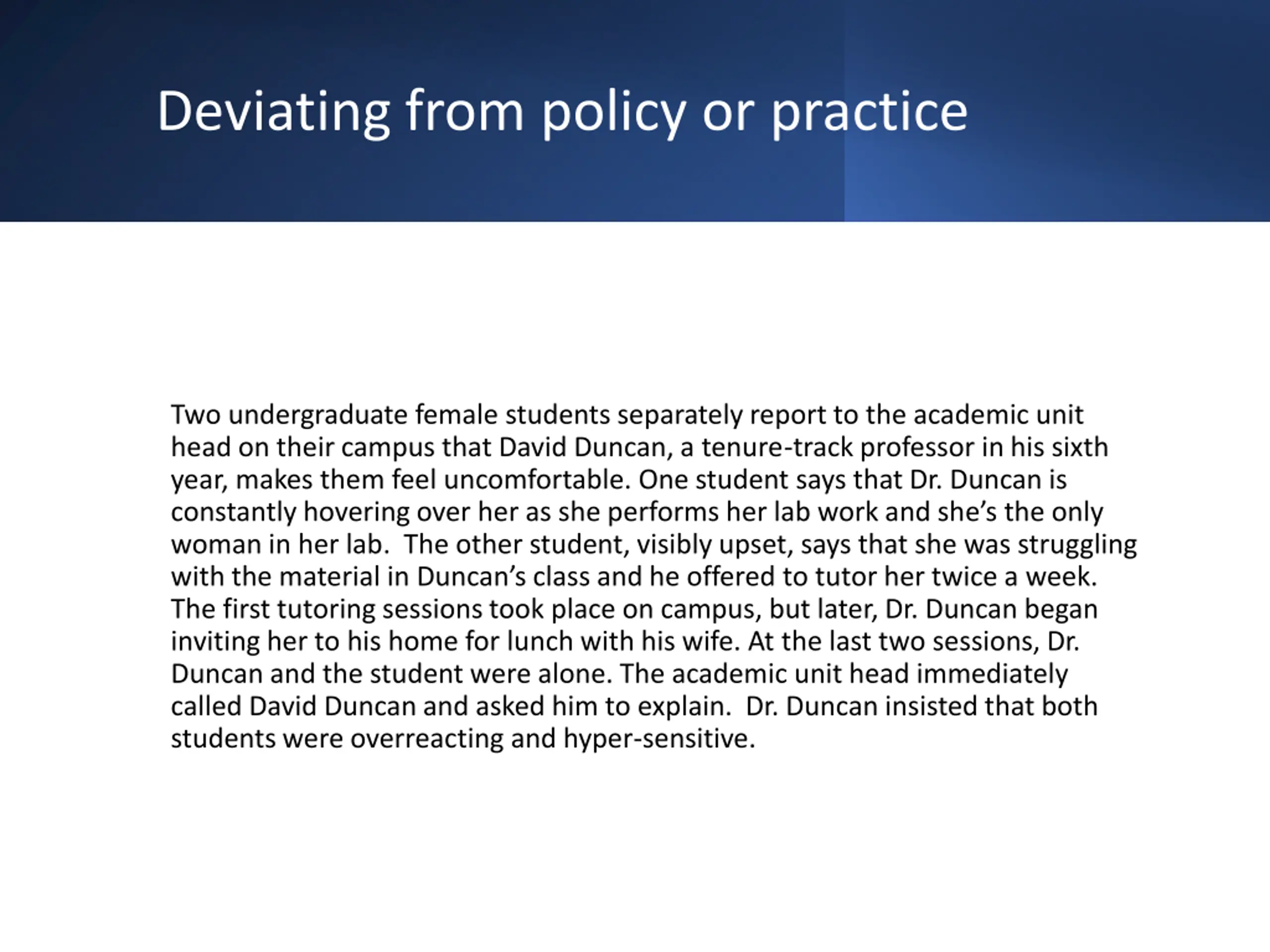 Deviating from policy or practice Two undergraduate female students separately report to the academic unit head on their campus that David Duncan, a tenure-track professor in his sixth year, makes them feel uncomfortable. One student says that Dr. Duncan is constantly hovering over her as she performs her lab work and she s the only woman in her lab. The other student, visibly upset, says that she was struggling with the material in Duncan s class and he offered to tutor her twice a week. The first tutoring sessions took place on campus, but later, Dr. Duncan began inviting her to his home for lunch with his wife. At the last two sessions, Dr. Duncan and the student were alone. The academic unit head immediately called David Duncan and asked him to explain. Dr. Duncan insisted that both students were overreacting and hyper-sensitive.