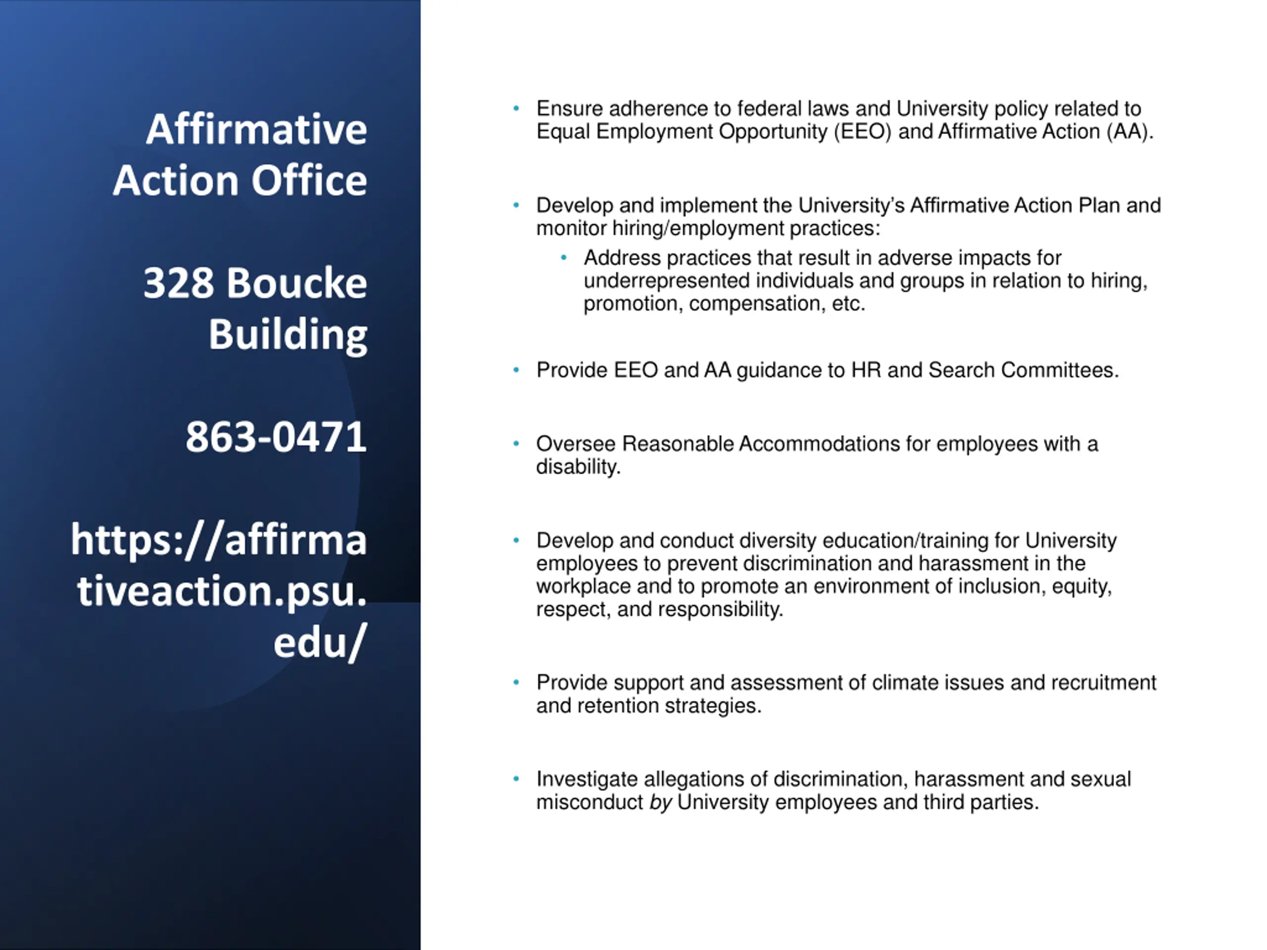 Ensure adherence to federal laws and University policy related to Equal Employment Opportunity (EEO) and Affirmative Action (AA). Affirmative Action Office Develop and implement the University s Affirmative Action Plan and monitor hiring/employment practices: Address practices that result in adverse impacts for underrepresented individuals and groups in relation to hiring, promotion, compensation, etc. 328 Boucke Building Provide EEO and AA guidance to HR and Search Committees. 863-0471 Oversee Reasonable Accommodations for employees with a disability. https://affirma tiveaction.psu. Develop and conduct diversity education/training for University employees to prevent discrimination and harassment in the workplace and to promote an environment of inclusion, equity, respect, and responsibility. edu/ Provide support and assessment of climate issues and recruitment and retention strategies. Investigate allegations of discrimination, harassment and sexual misconduct by University employees and third parties.