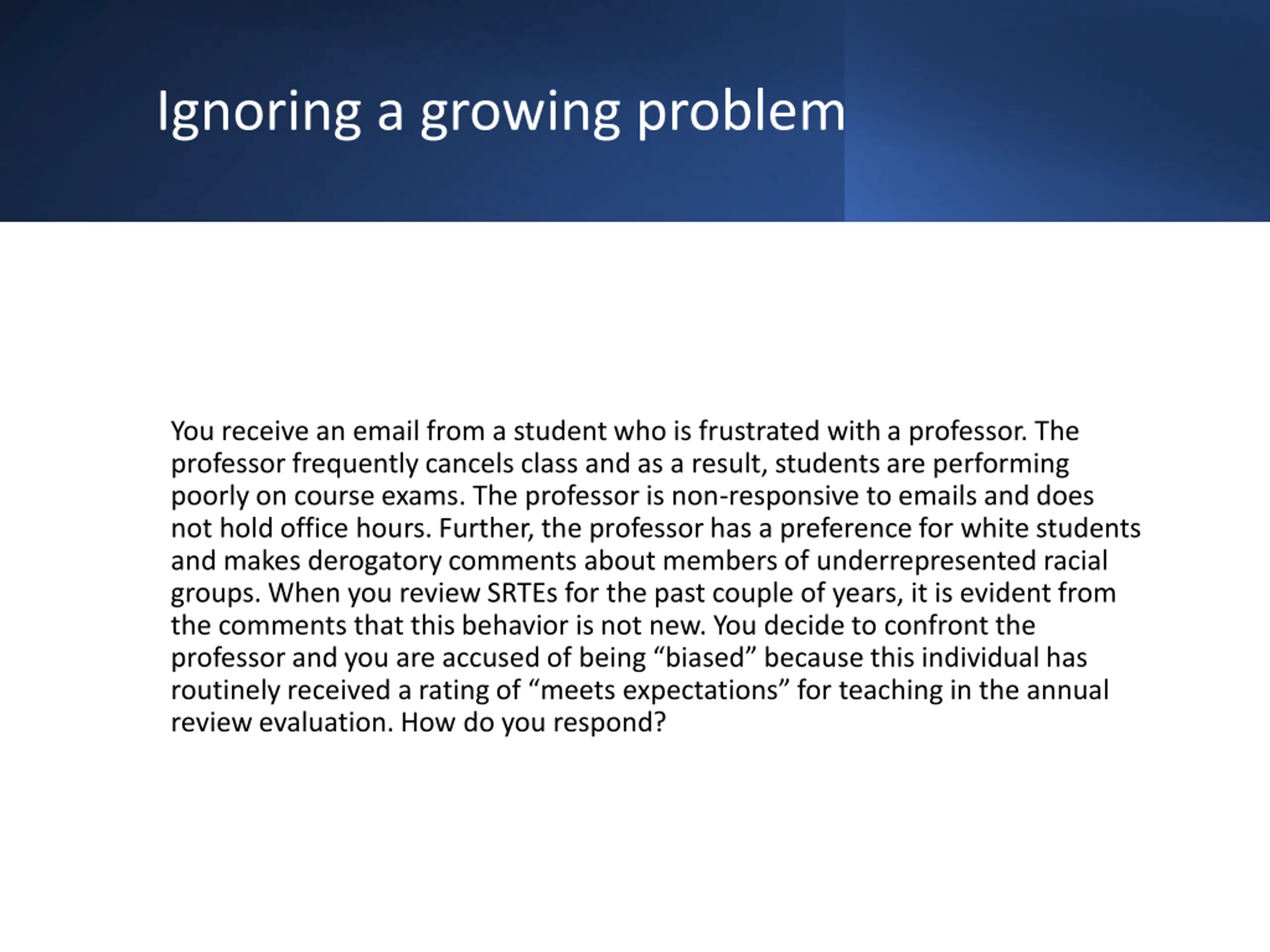 Ignoring a growing problem You receive an email from a student who is frustrated with a professor. The professor frequently cancels class and as a result, students are performing poorly on course exams. The professor is non-responsive to emails and does not hold office hours. Further, the professor has a preference for white students and makes derogatory comments about members of underrepresented racial groups. When you review SRTEs for the past couple of years, it is evident from the comments that this behavior is not new. You decide to confront the professor and you are accused of being biased because this individual has routinely received a rating of meets expectations for teaching in the annual review evaluation. How do you respond?