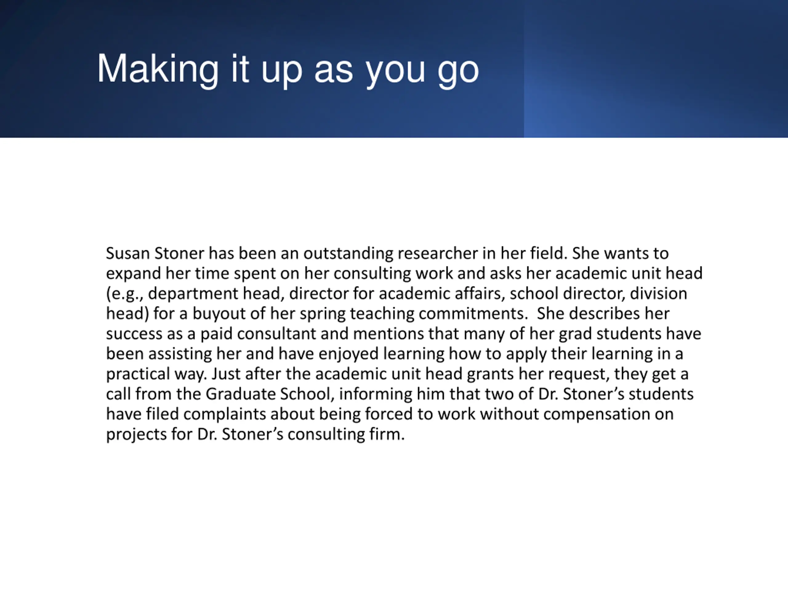 Making it up as you go Susan Stoner has been an outstanding researcher in her field. She wants to expand her time spent on her consulting work and asks her academic unit head (e.g., department head, director for academic affairs, school director, division head) for a buyout of her spring teaching commitments. She describes her success as a paid consultant and mentions that many of her grad students have been assisting her and have enjoyed learning how to apply their learning in a practical way. Just after the academic unit head grants her request, they get a call from the Graduate School, informing him that two of Dr. Stoner s students have filed complaints about being forced to work without compensation on projects for Dr. Stoner s consulting firm.