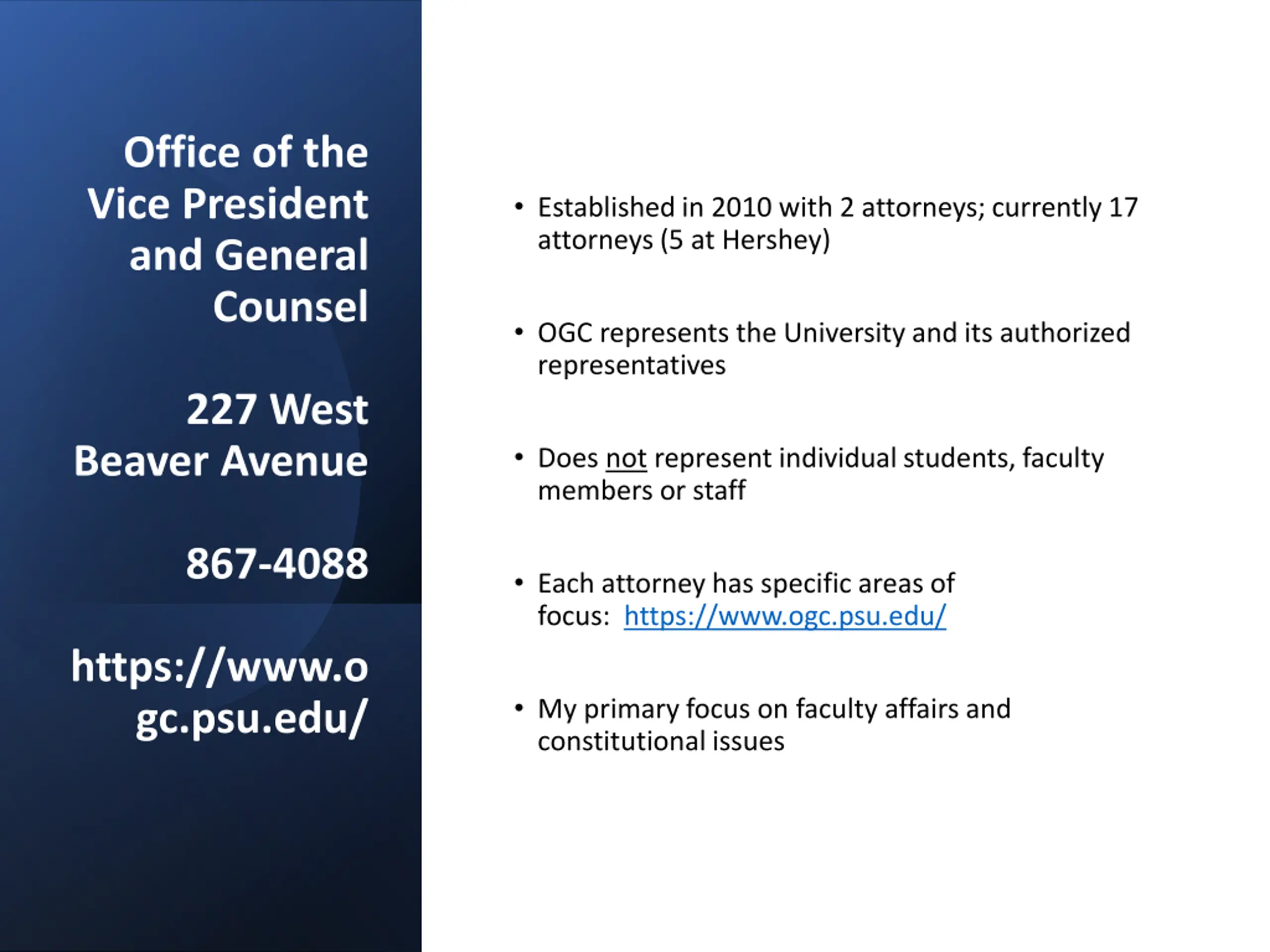Office of the Vice President and General Counsel Established in 2010 with 2 attorneys; currently 17 attorneys (5 at Hershey) OGC represents the University and its authorized representatives 227 West Beaver Avenue Does not represent individual students, faculty members or staff 867-4088 Each attorney has specific areas of focus: https://www.ogc.psu.edu/ https://www.o gc.psu.edu/ My primary focus on faculty affairs and constitutional issues
