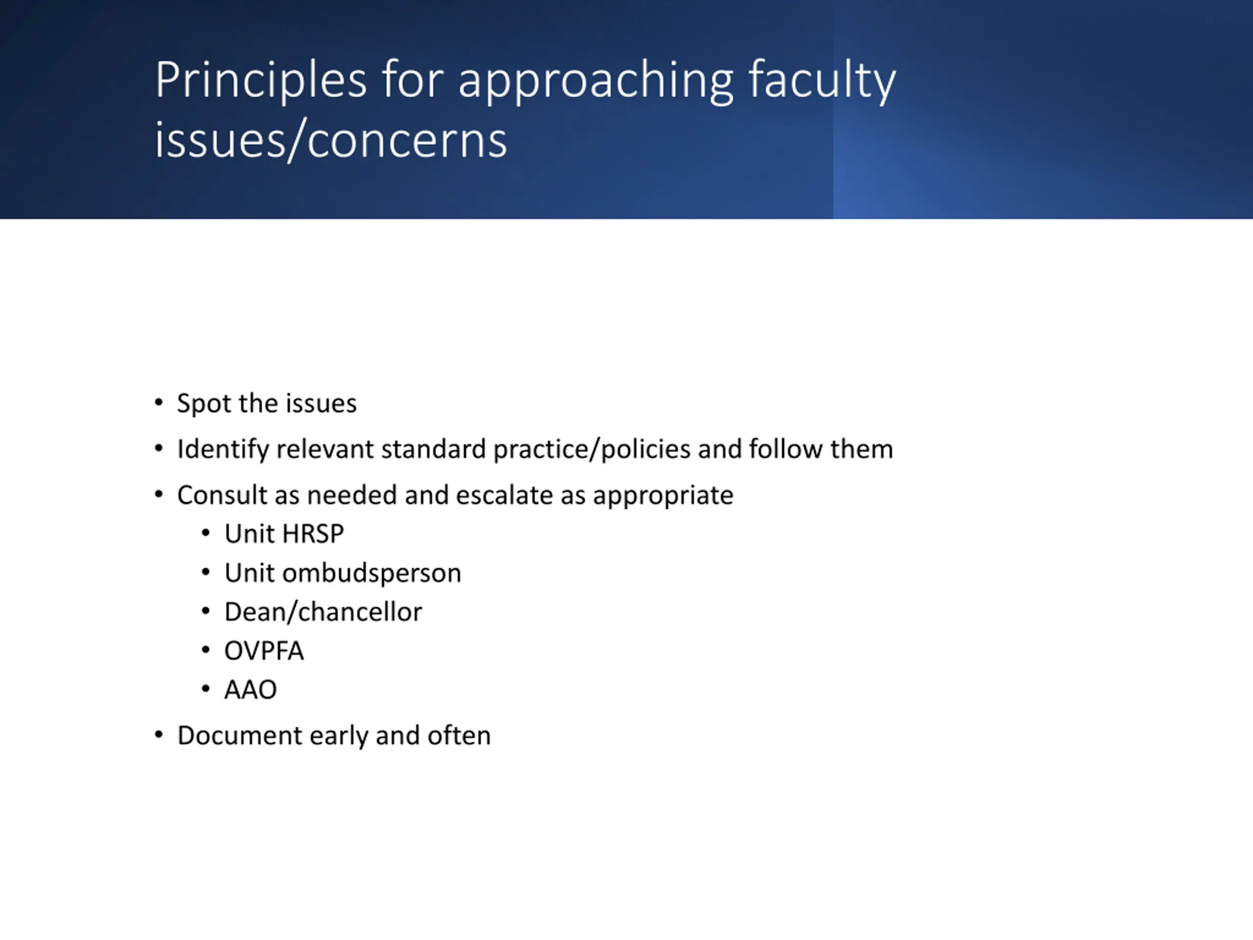 Principles for approaching faculty issues/concerns Spot the issues Identify relevant standard practice/policies and follow them Consult as needed and escalate as appropriate Unit HRSP Unit ombudsperson Dean/chancellor OVPFA AAO Document early and often