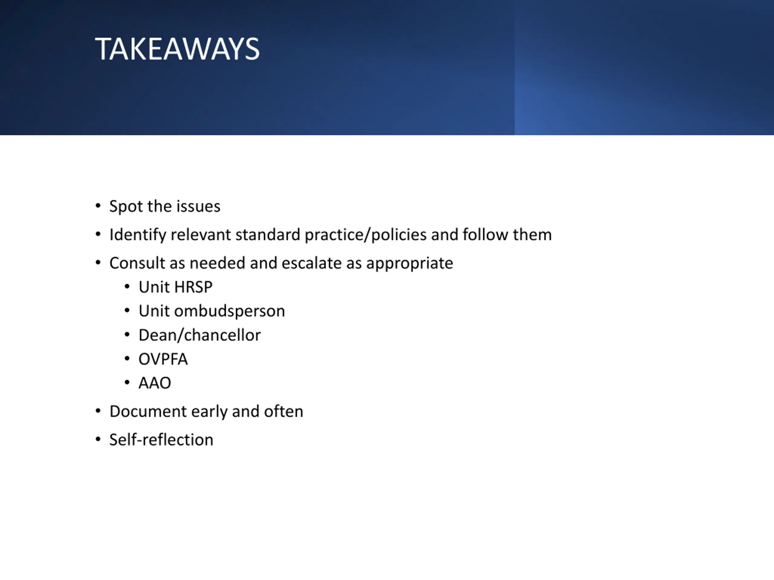 TAKEAWAYS Spot the issues Identify relevant standard practice/policies and follow them Consult as needed and escalate as appropriate Unit HRSP Unit ombudsperson Dean/chancellor OVPFA AAO Document early and often Self-reflection