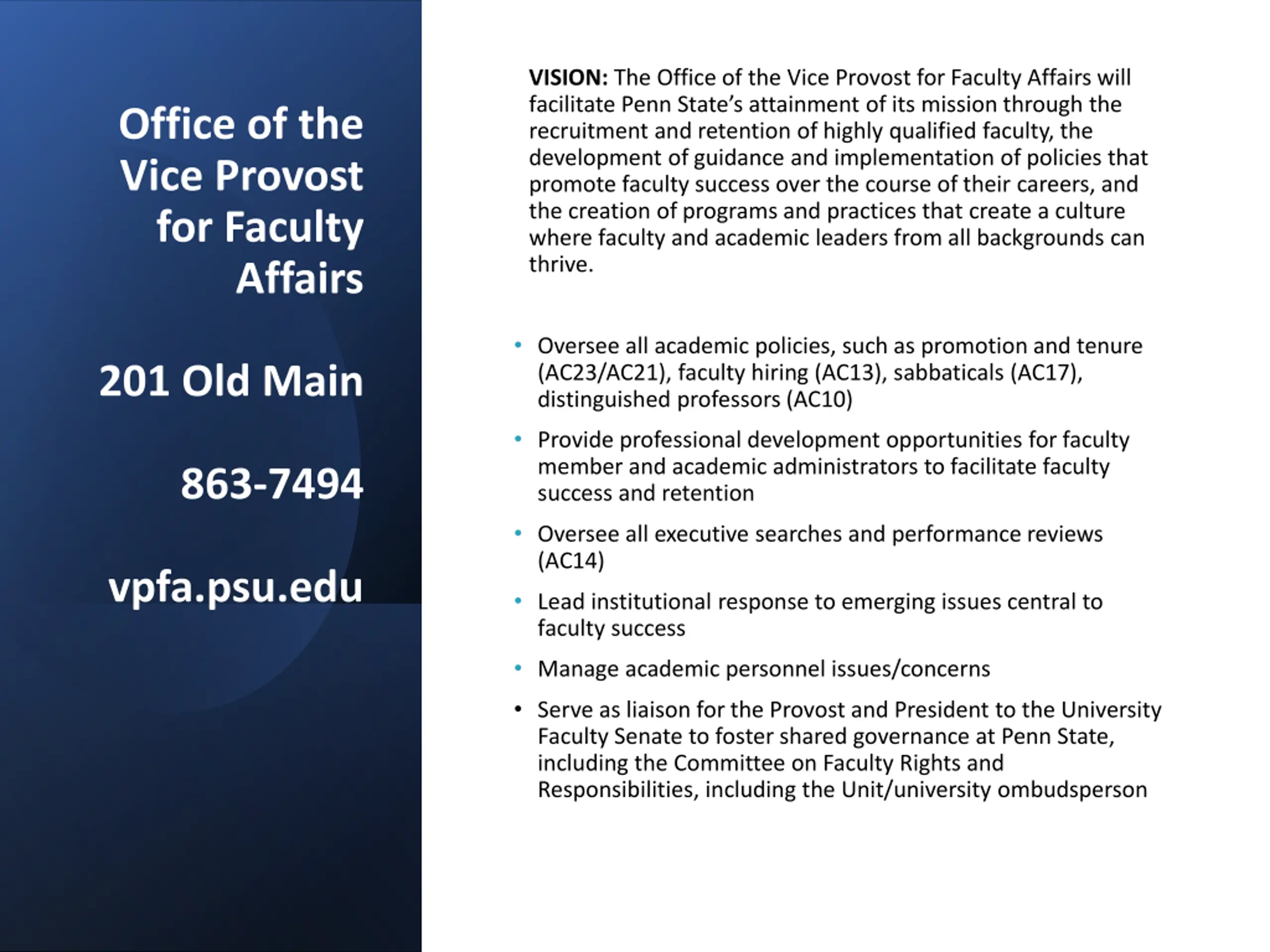 VISION: The Office of the Vice Provost for Faculty Affairs will facilitate Penn State s attainment of its mission through the recruitment and retention of highly qualified faculty, the development of guidance and implementation of policies that promote faculty success over the course of their careers, and the creation of programs and practices that create a culture where faculty and academic leaders from all backgrounds can thrive. Office of the Vice Provost for Faculty Affairs Oversee all academic policies, such as promotion and tenure (AC23/AC21), faculty hiring (AC13), sabbaticals (AC17), distinguished professors (AC10) Provide professional development opportunities for faculty member and academic administrators to facilitate faculty success and retention Oversee all executive searches and performance reviews (AC14) Lead institutional response to emerging issues central to faculty success Manage academic personnel issues/concerns Serve as liaison for the Provost and President to the University Faculty Senate to foster shared governance at Penn State, including the Committee on Faculty Rights and Responsibilities, including the Unit/university ombudsperson 201 Old Main 863-7494 vpfa.psu.edu