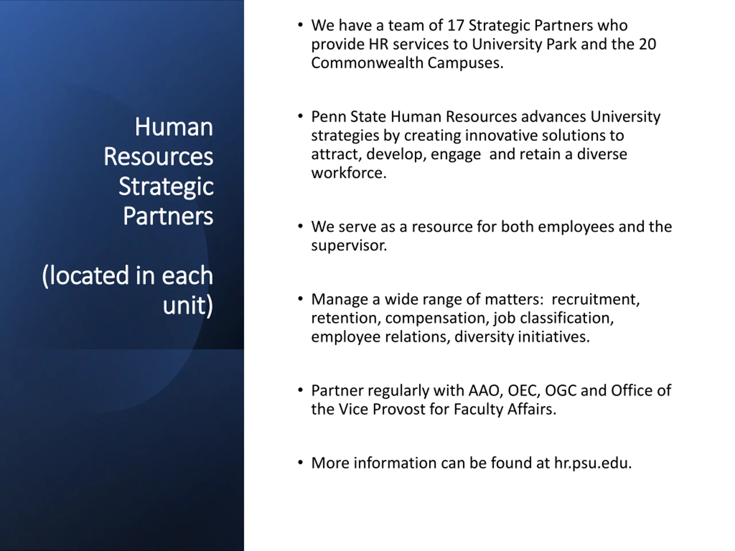 We have a team of 17 Strategic Partners who provide HR services to University Park and the 20 Commonwealth Campuses. Penn State Human Resources advances University strategies by creating innovative solutions to attract, develop, engage and retain a diverse workforce. Human Human Resources Resources Strategic Strategic Partners Partners We serve as a resource for both employees and the supervisor. (located in each (located in each Manage a wide range of matters: recruitment, retention, compensation, job classification, employee relations, diversity initiatives. unit) unit) Partner regularly with AAO, OEC, OGC and Office of the Vice Provost for Faculty Affairs. More information can be found at hr.psu.edu.