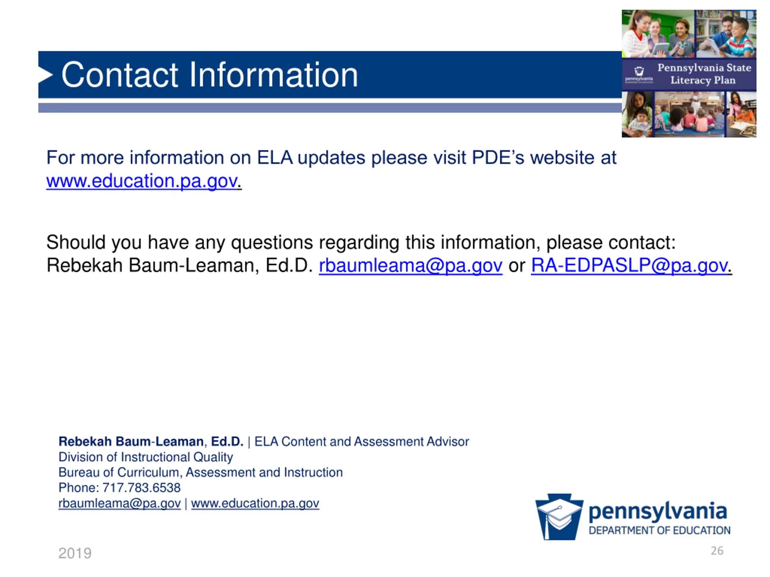 Contact Information For more information on ELA updates please visit PDE s website at www.education.pa.gov. Should you have any questions regarding this information, please contact: Rebekah Baum-Leaman, Ed.D. rbaumleama@pa.gov or RA-EDPASLP@pa.gov. RebekahBaum-Leaman, Ed.D. | ELA Content and Assessment Advisor Division of Instructional Quality Bureau of Curriculum, Assessment and Instruction Phone: 717.783.6538 rbaumleama@pa.gov | www.education.pa.gov 2019 26