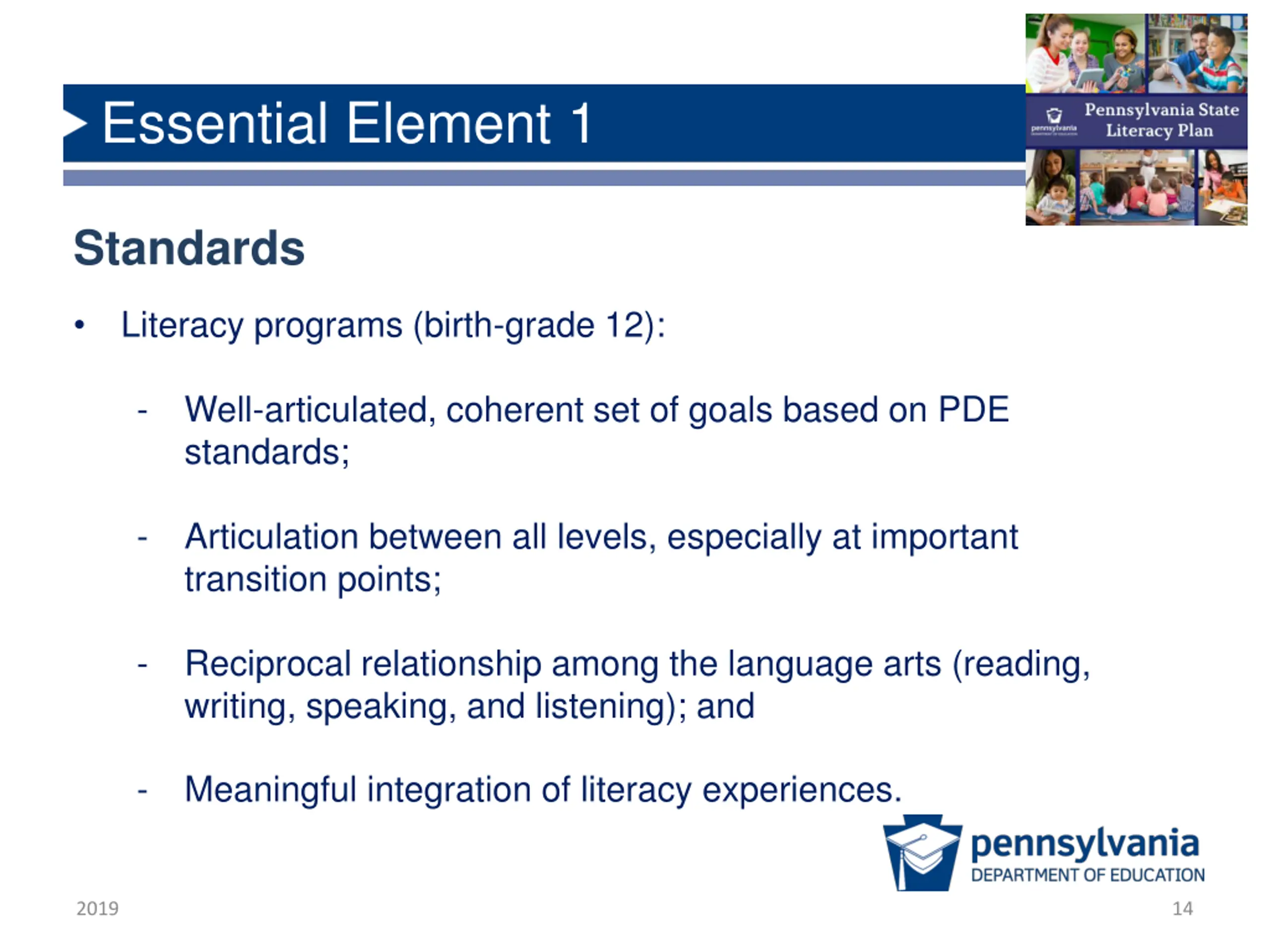 Essential Element 1 Standards Literacy programs (birth-grade 12): - Well-articulated, coherent set of goals based on PDE standards; - Articulation between all levels, especially at important transition points; - Reciprocal relationship among the language arts (reading, writing, speaking, and listening); and - Meaningful integration of literacy experiences. 2019 14