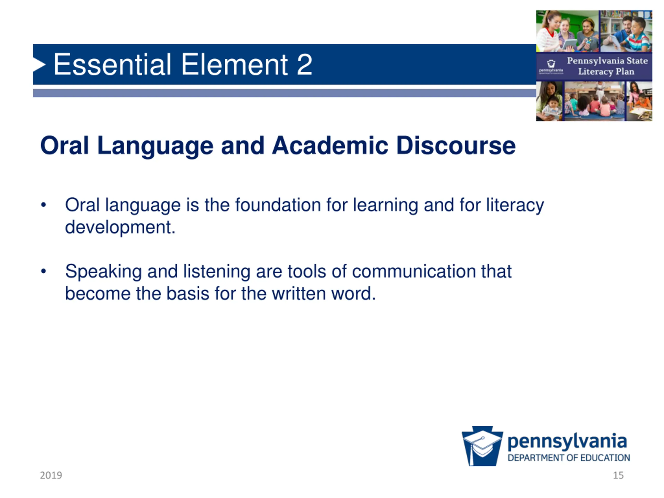 Essential Element 2 Oral Language and Academic Discourse Oral language is the foundation for learning and for literacy development. Speaking and listening are tools of communication that become the basis for the written word. 2019 15