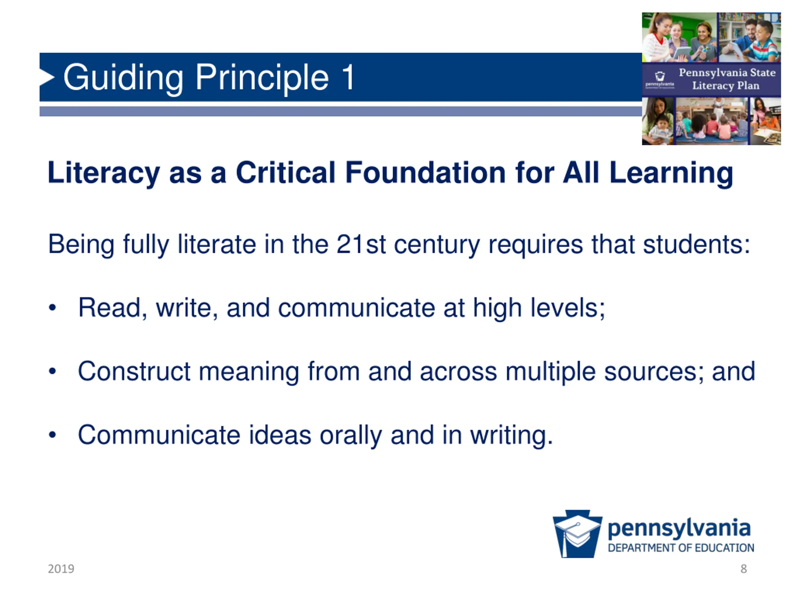 Guiding Principle 1 Literacy as a Critical Foundation for All Learning Being fully literate in the 21st century requires that students: Read, write, and communicate at high levels; Construct meaning from and across multiple sources; and Communicate ideas orally and in writing. 2019 8
