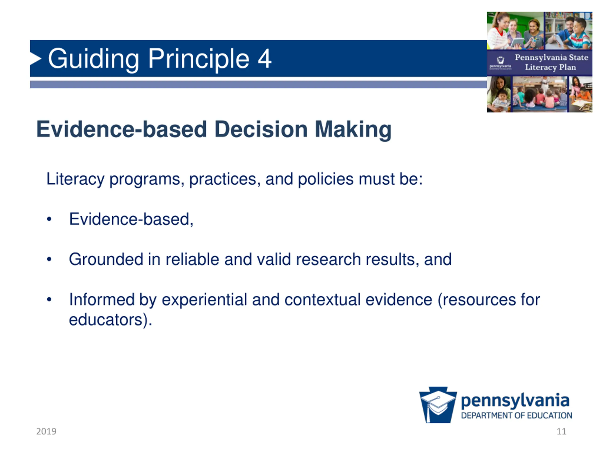 Guiding Principle 4 Evidence-based Decision Making Literacy programs, practices, and policies must be: Evidence-based, Grounded in reliable and valid research results, and Informed by experiential and contextual evidence (resources for educators). 2019 11