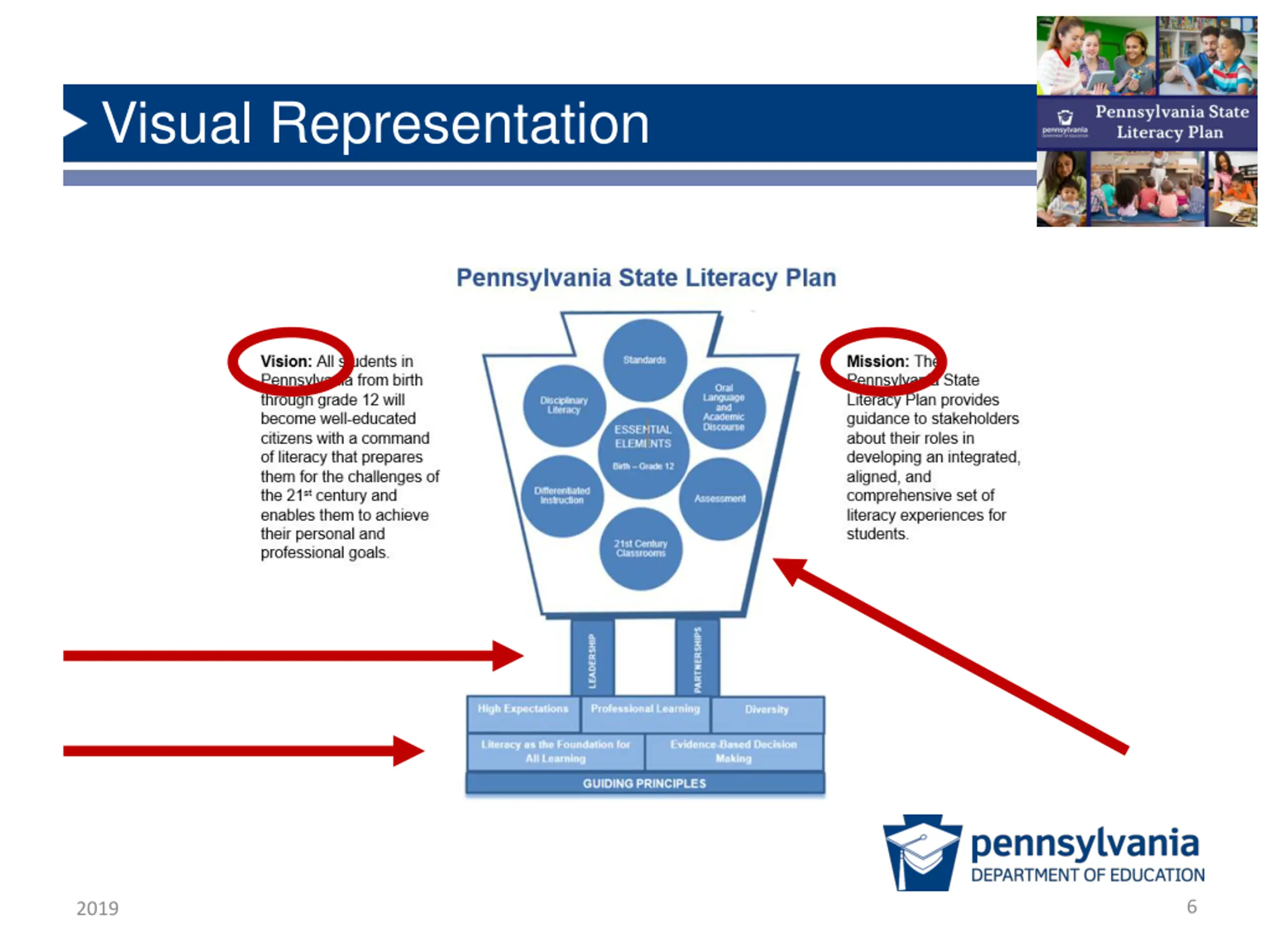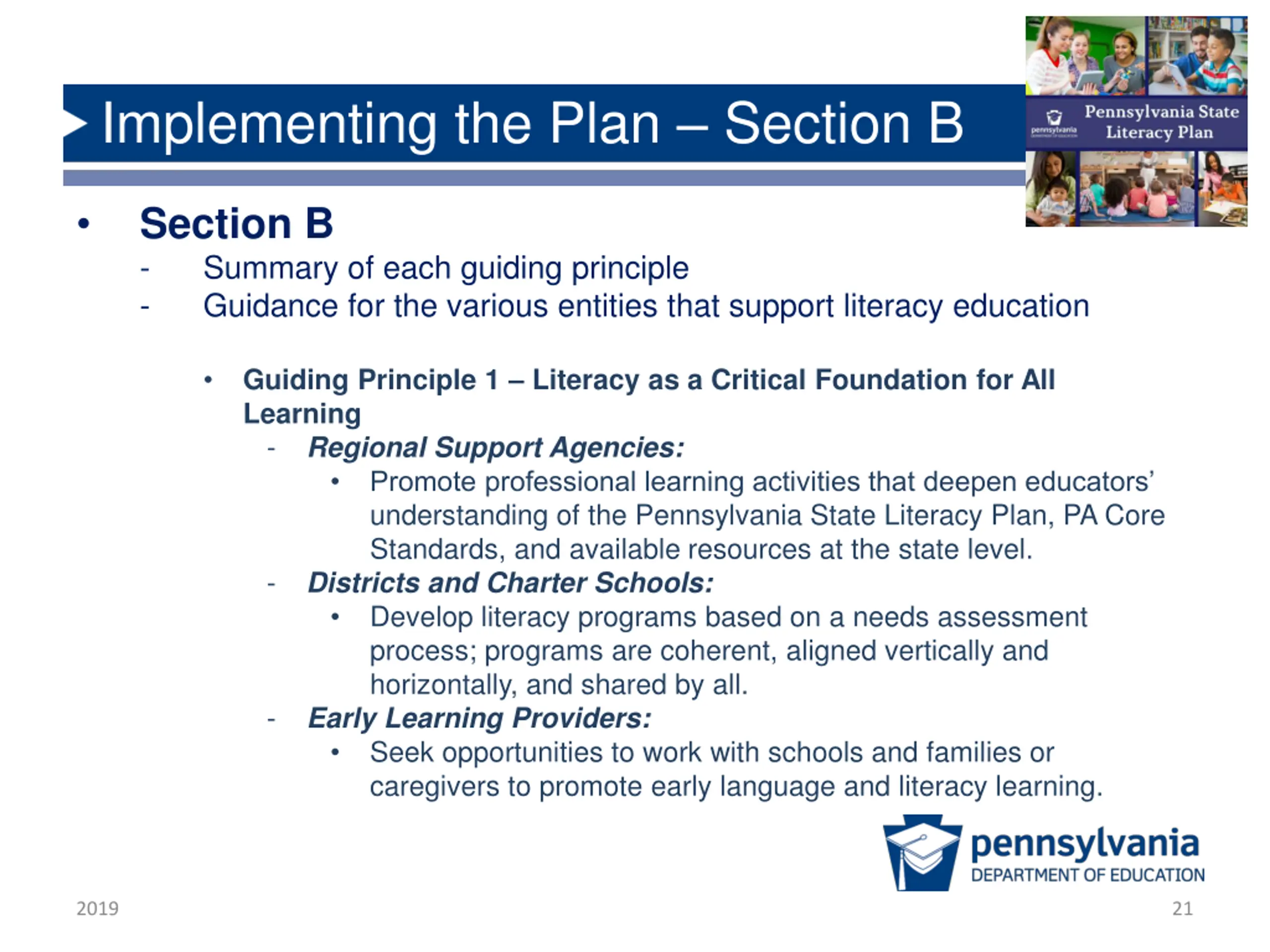 Implementing the Plan Section B Section B - Summary of each guiding principle - Guidance for the various entities that support literacy education Guiding Principle 1 Literacy as a Critical Foundation for All Learning - Regional Support Agencies: Promote professional learning activities that deepen educators understanding of the Pennsylvania State Literacy Plan, PA Core Standards, and available resources at the state level. - Districts and Charter Schools: Develop literacy programs based on a needs assessment process; programs are coherent, aligned vertically and horizontally, and shared by all. - Early Learning Providers: Seek opportunities to work with schools and families or caregivers to promote early language and literacy learning. 2019 21