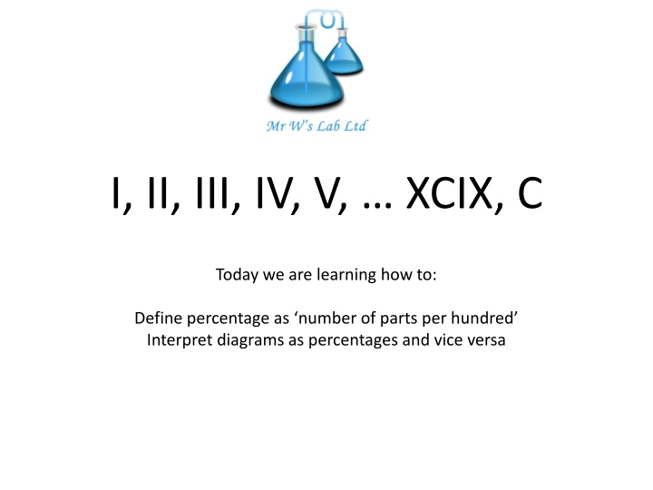 I, II, III, IV, V, XCIX, C Today we are learning how to: Define percentage as number of parts per hundred Interpret diagrams as percentages and vice versa