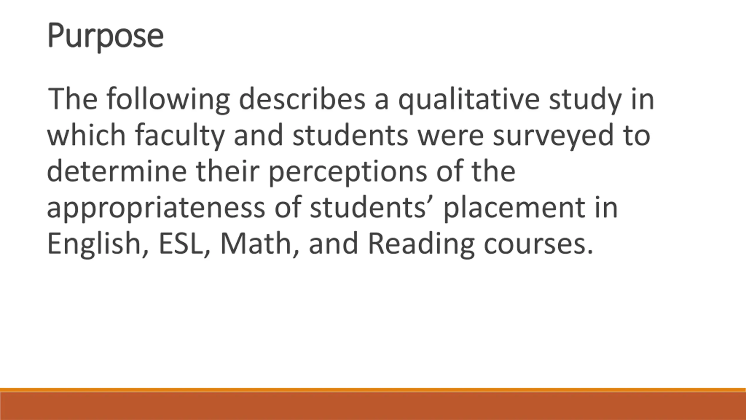 Purpose Purpose The following describes a qualitative study in which faculty and students were surveyed to determine their perceptions of the appropriateness of students placement in English, ESL, Math, and Reading courses.