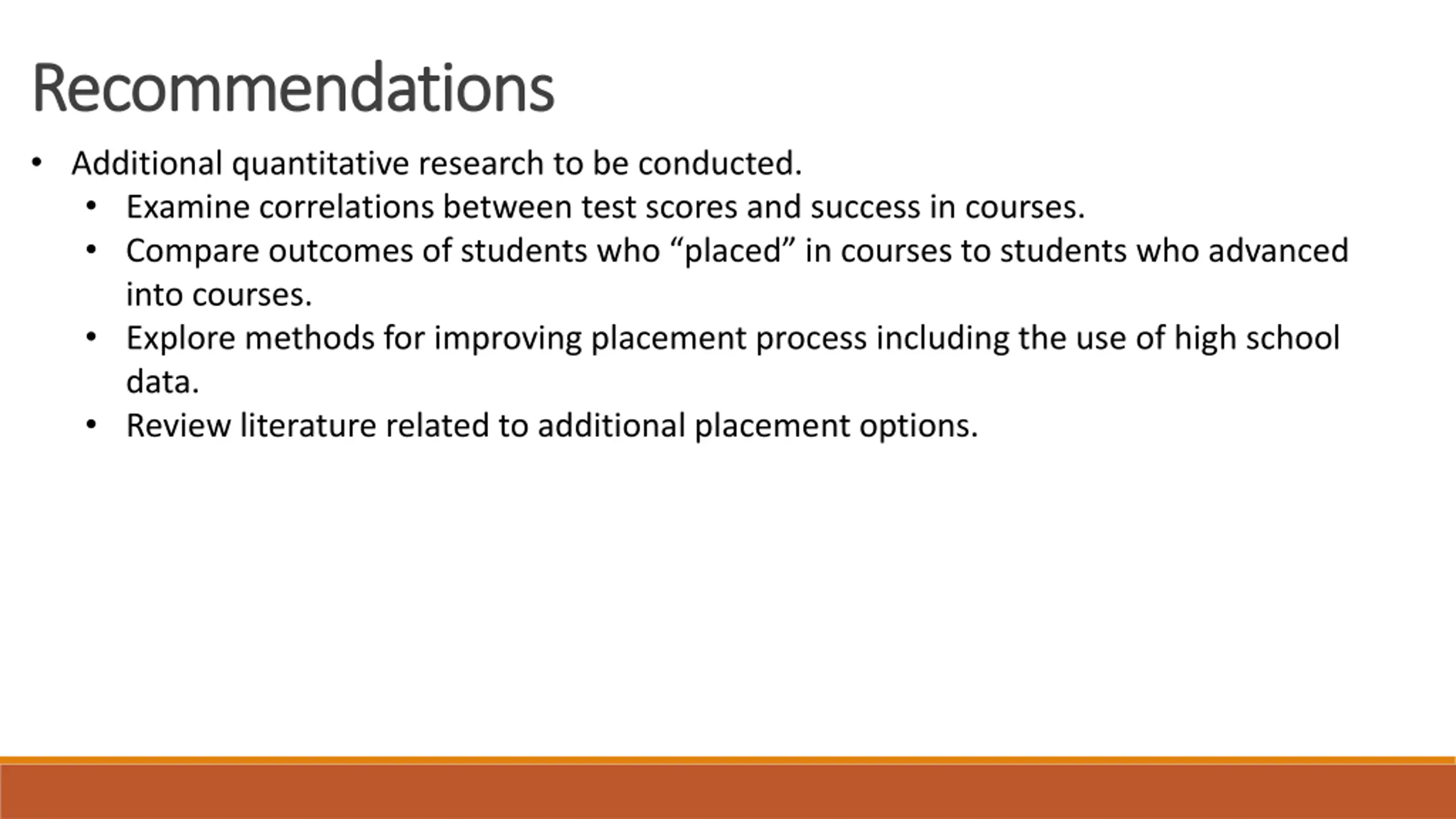 Recommendations Recommendations Additional quantitative research to be conducted. Examine correlations between test scores and success in courses. Compare outcomes of students who placed in courses to students who advanced into courses. Explore methods for improving placement process including the use of high school data. Review literature related to additional placement options.