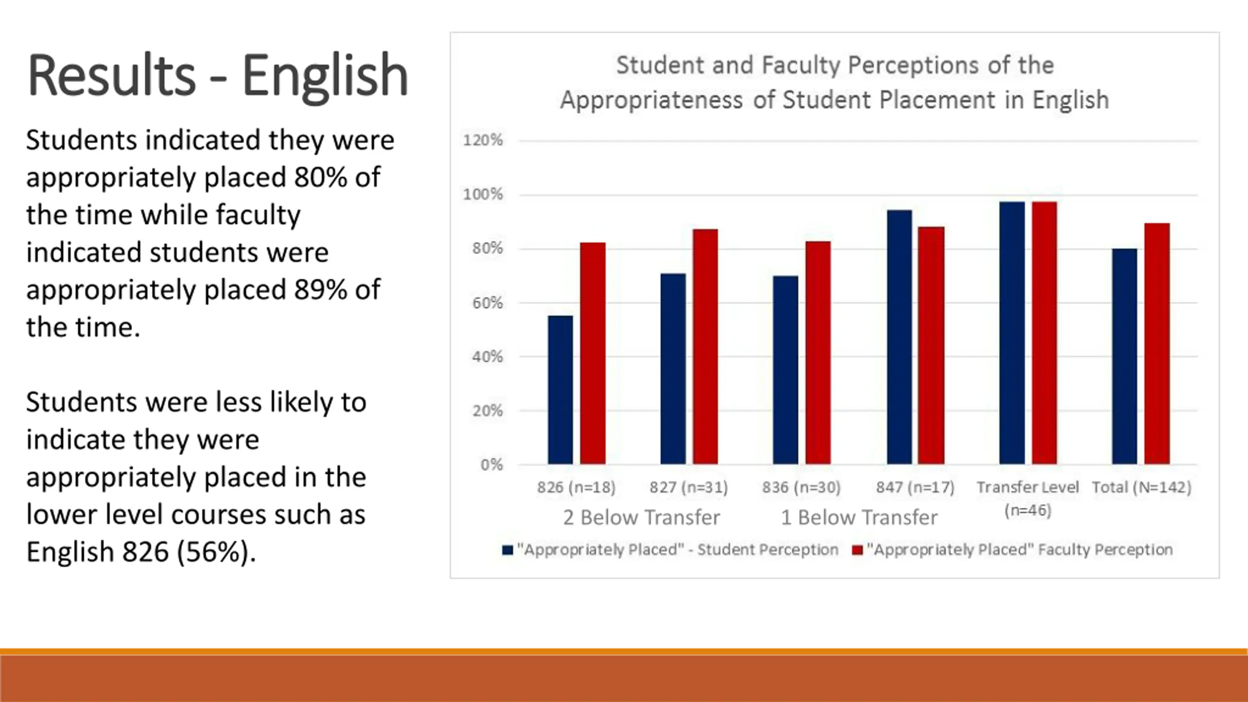 Results Results - -English English Students indicated they were appropriately placed 80% of the time while faculty indicated students were appropriately placed 89% of the time. Students were less likely to indicate they were appropriately placed in the lower level courses such as English 826 (56%). 2 Below Transfer 1 Below Transfer