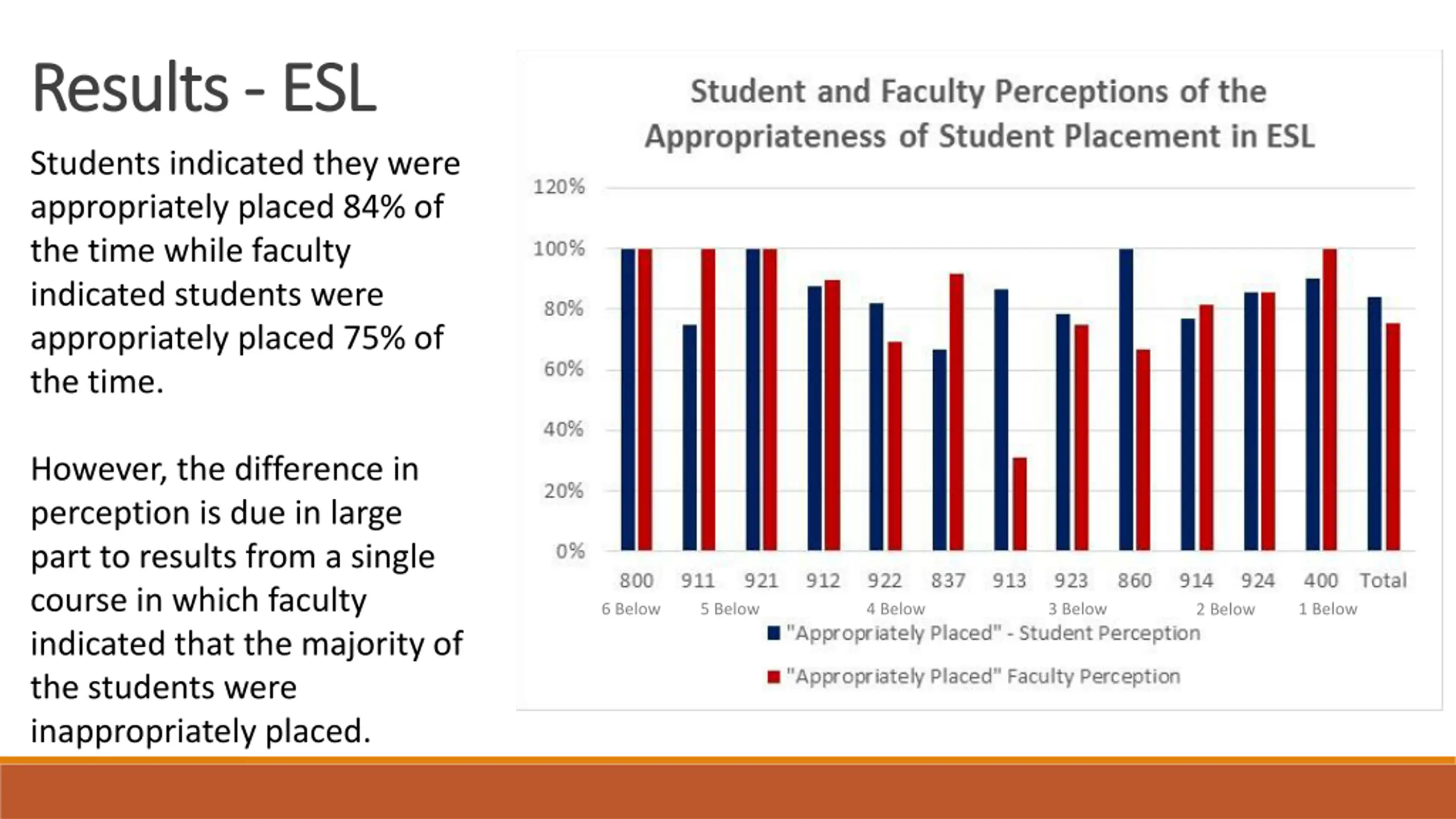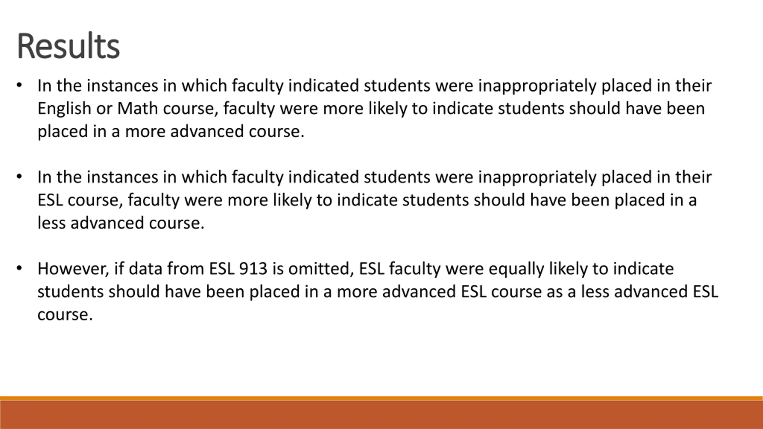 Results Results In the instances in which faculty indicated students were inappropriately placed in their English or Math course, faculty were more likely to indicate students should have been placed in a more advanced course. In the instances in which faculty indicated students were inappropriately placed in their ESL course, faculty were more likely to indicate students should have been placed in a less advanced course. However, if data from ESL 913 is omitted, ESL faculty were equally likely to indicate students should have been placed in a more advanced ESL course as a less advanced ESL course.