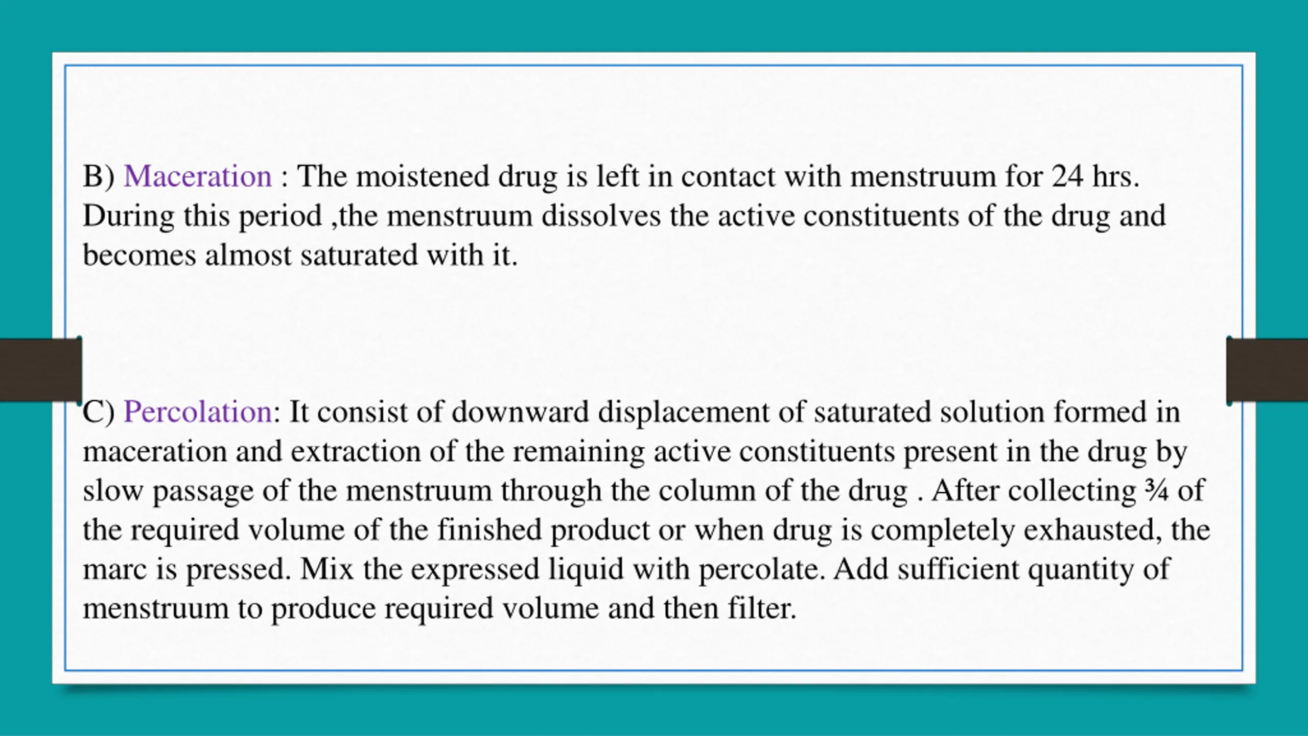 B) Maceration : The moistened drug is left in contact with menstruum for 24 hrs. During this period ,the menstruum dissolves the active constituents of the drug and becomes almost saturated with it. C) Percolation: It consist of downward displacement of saturated solution formed in maceration and extraction of the remaining active constituents present in the drug by slow passage of the menstruum through the column of the drug . After collecting of the required volume of the finished product or when drug is completely exhausted, the marc is pressed. Mix the expressed liquid with percolate. Add sufficient quantity of menstruum to produce required volume and then filter.