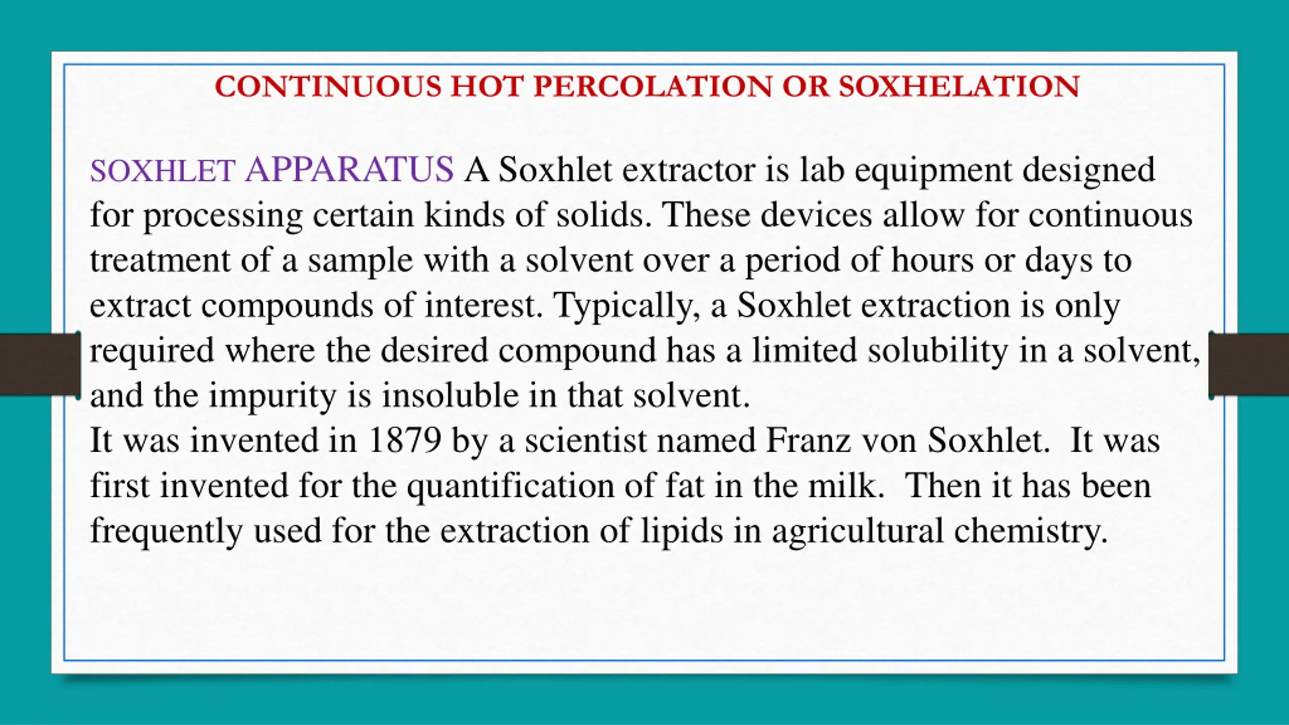 CONTINUOUS HOT PERCOLATION OR SOXHELATION SOXHLET APPARATUS A Soxhlet extractor is lab equipment designed for processing certain kinds of solids. These devices allow for continuous treatment of a sample with a solvent over a period of hours or days to extract compounds of interest. Typically, a Soxhlet extraction is only required where the desired compound has a limited solubility in a solvent, and the impurity is insoluble in that solvent. It was invented in 1879 by a scientist named Franz von Soxhlet. It was first invented for the quantification of fat in the milk. Then it has been frequently used for the extraction of lipids in agricultural chemistry.