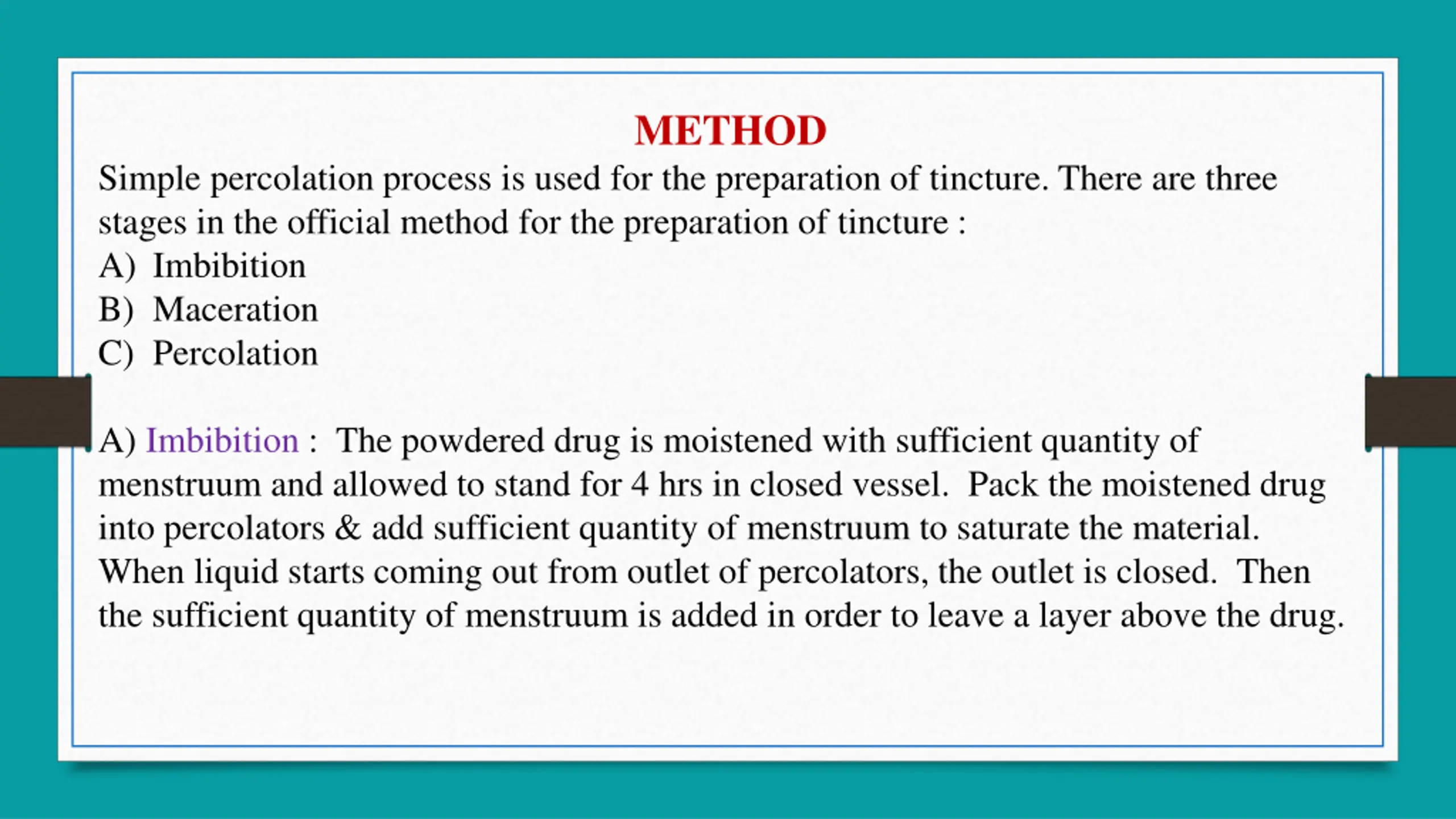 METHOD Simple percolation process is used for the preparation of tincture. There are three stages in the official method for the preparation of tincture : A) Imbibition B) Maceration C) Percolation A) Imbibition : The powdered drug is moistened with sufficient quantity of menstruum and allowed to stand for 4 hrs in closed vessel. Pack the moistened drug into percolators & add sufficient quantity of menstruum to saturate the material. When liquid starts coming out from outlet of percolators, the outlet is closed. Then the sufficient quantity of menstruum is added in order to leave a layer above the drug.