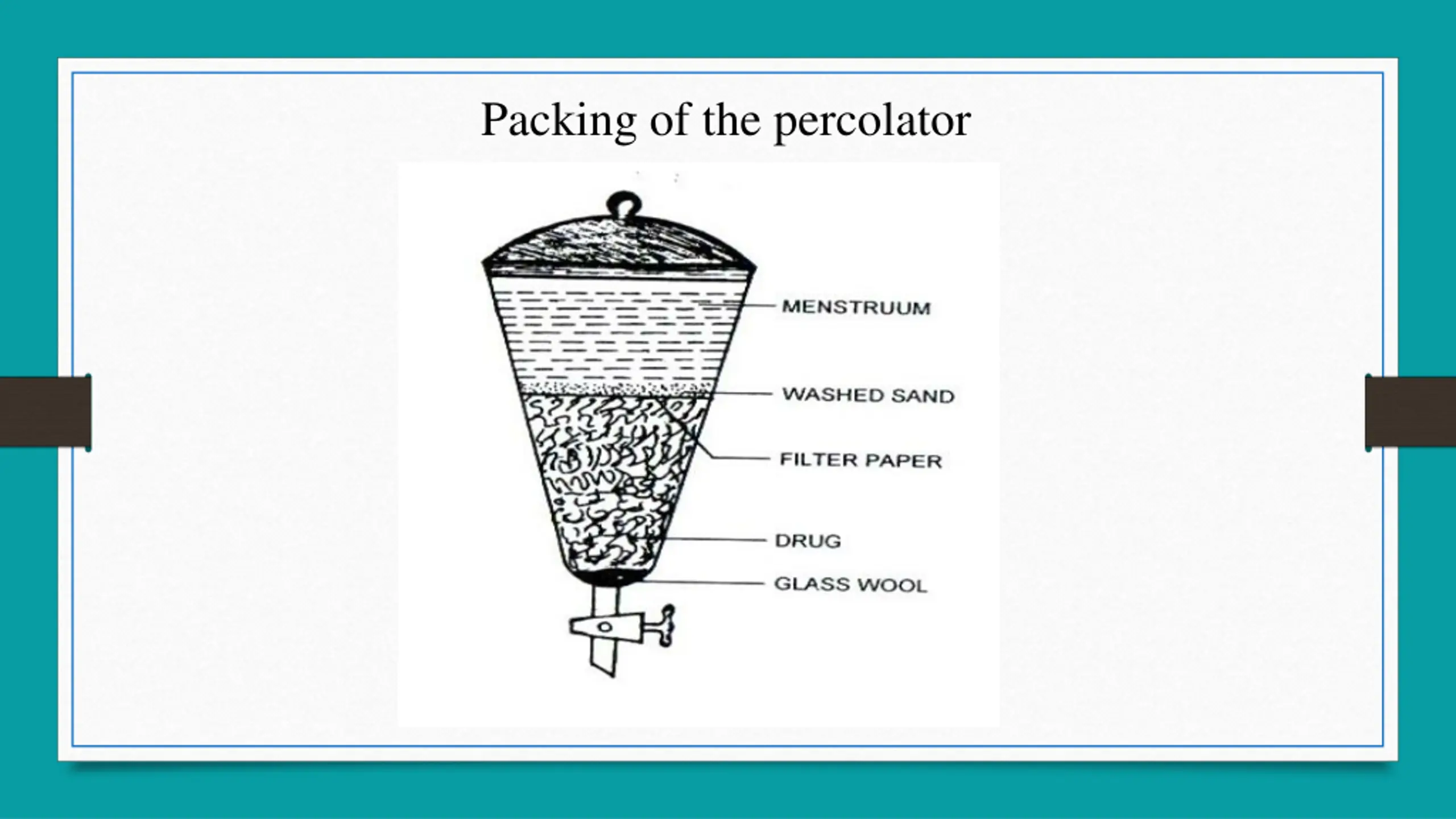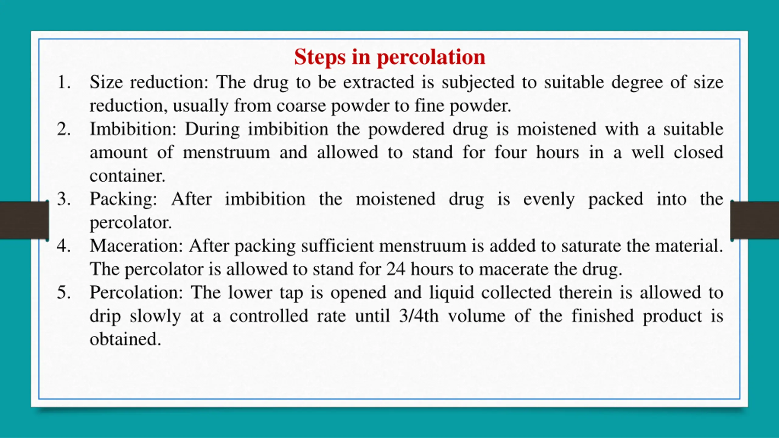 Steps in percolation 1. Size reduction: The drug to be extracted is subjected to suitable degree of size reduction, usually from coarse powder to fine powder. Imbibition: During imbibition the powdered drug is moistened with a suitable amount of menstruum and allowed to stand for four hours in a well closed container. Packing: After imbibition the moistened drug is evenly packed into the percolator. Maceration: After packing sufficient menstruum is added to saturate the material. The percolator is allowed to stand for 24 hours to macerate the drug. Percolation: The lower tap is opened and liquid collected therein is allowed to drip slowly at a controlled rate until 3/4th volume of the finished product is obtained. 2. 3. 4. 5.