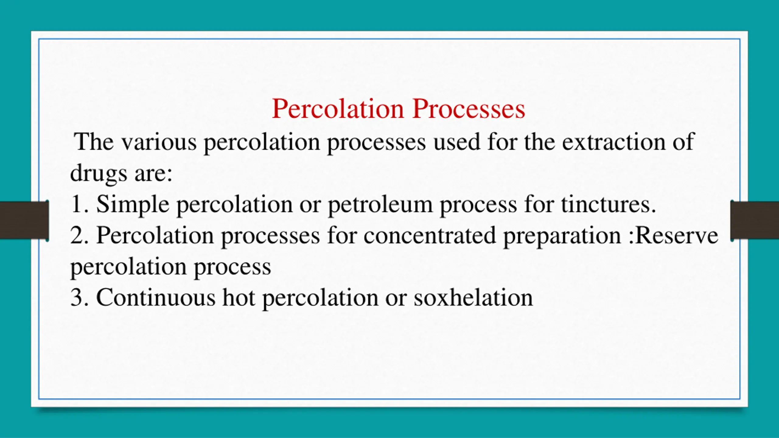 Percolation Processes The various percolation processes used for the extraction of drugs are: 1. Simple percolation or petroleum process for tinctures. 2. Percolation processes for concentrated preparation :Reserve percolation process 3. Continuous hot percolation or soxhelation